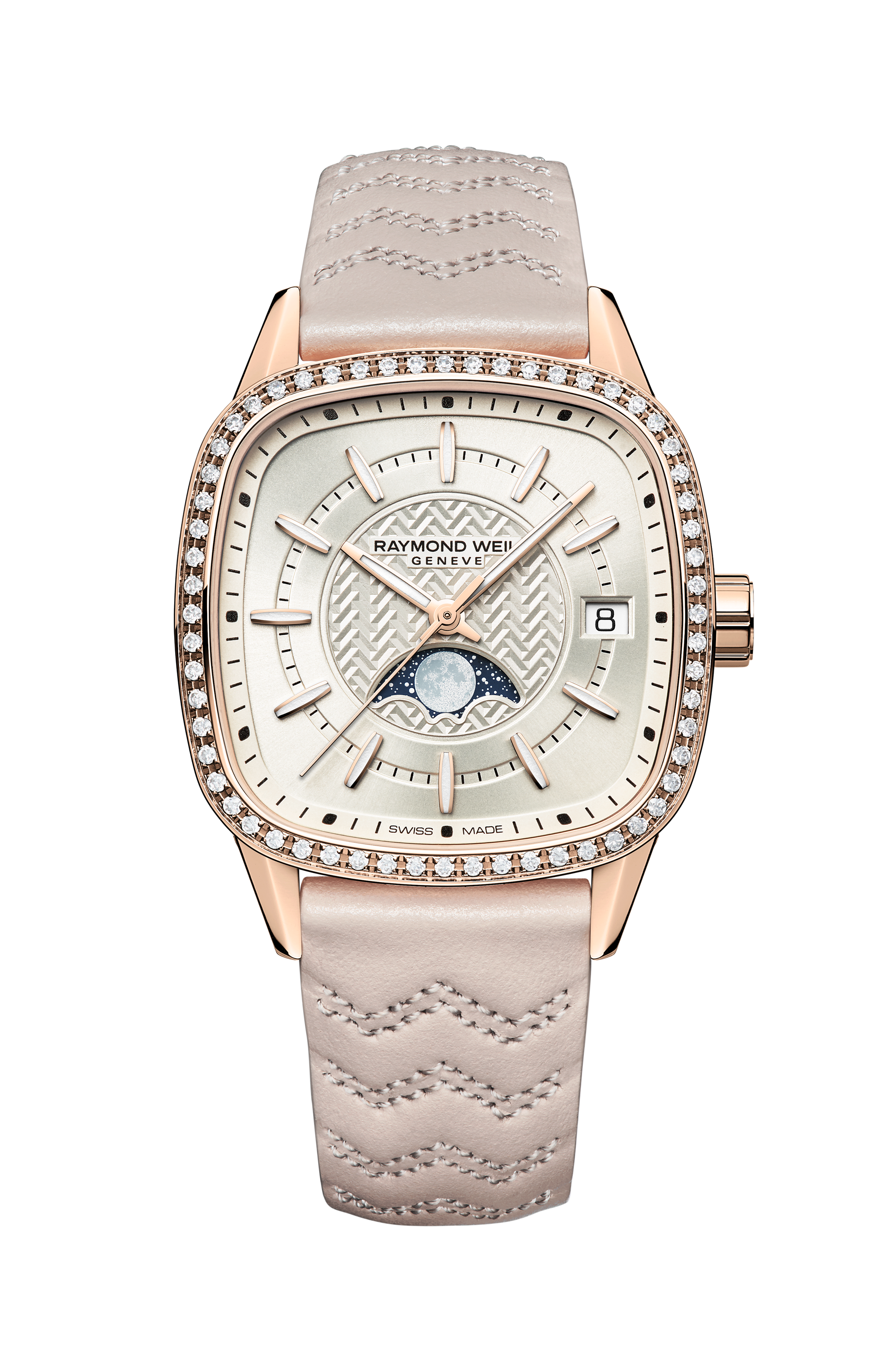 The dial’s cream draws the eye towards the center, where a captivating W-shaped motif, as a nod to the RAYMOND WEIL brand, creates subtle shades that mesmerize the wearer