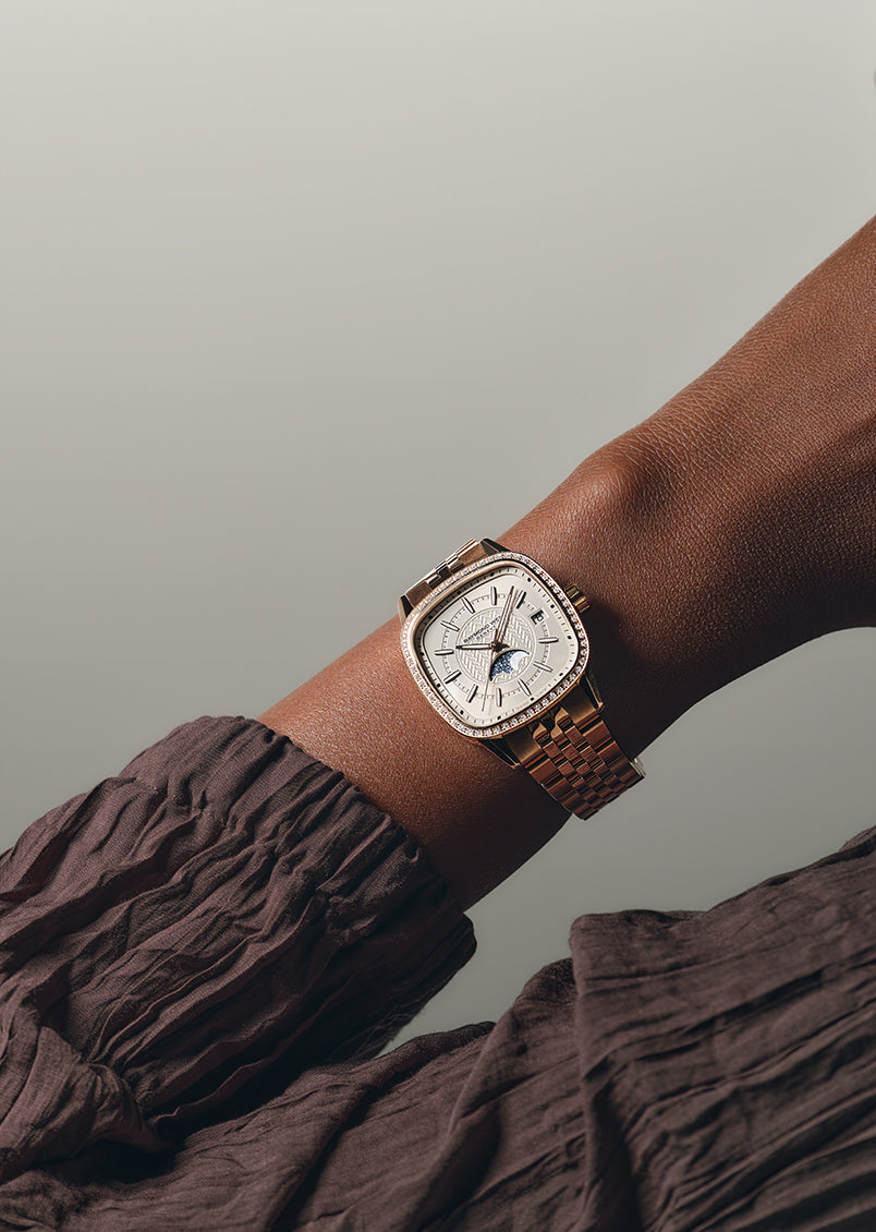 The next evolution of the freelancer automatic collection is a new interpretation of the form watch, that elegantly transcends convention. This model has been reimagined for the modern individual, fusing a cushion-shaped design with signature brand details that radiate contemporary sophistication. Measuring a 34 x 34 mm diameter, the freelancer ladies automatic has a square, cushion-shaped housing and features an automatic Swiss-made movement, with a 41 hours power reserve, ideally suited to daily wear. This model features luminescent hour and minute hands with matching indexes, a fine centre seconds hand and a date indication at 3 o’clock.