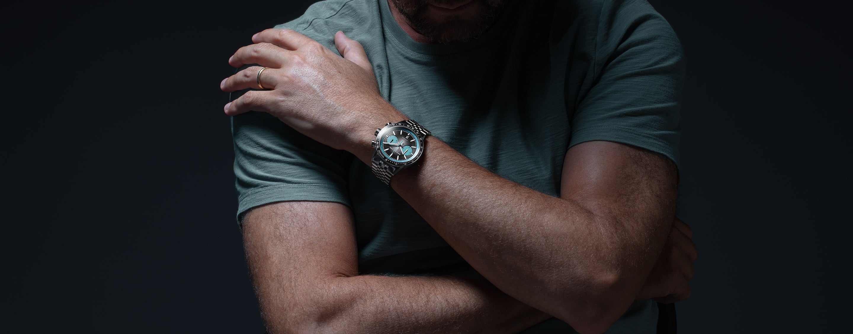 The black gradient dial serves as the perfect canvas for the turquoise accents of the chronograph and pulsometer counters, delivering a captivating pop of colour on the wrist. The symmetrical Bi-Compax layout features a 30-minute chronograph counter and a small seconds display, while the generously proportioned hour and minute hands, complemented by nickel-plated indexes enhanced with white Super-Luminova®, ensure optimal readability. Positioned at 6 o’clock, a date window contributes to the overall symmetry of the dial. The 5-row titanium bracelet completes the timepiece’s lightweight and ergonomic construction.