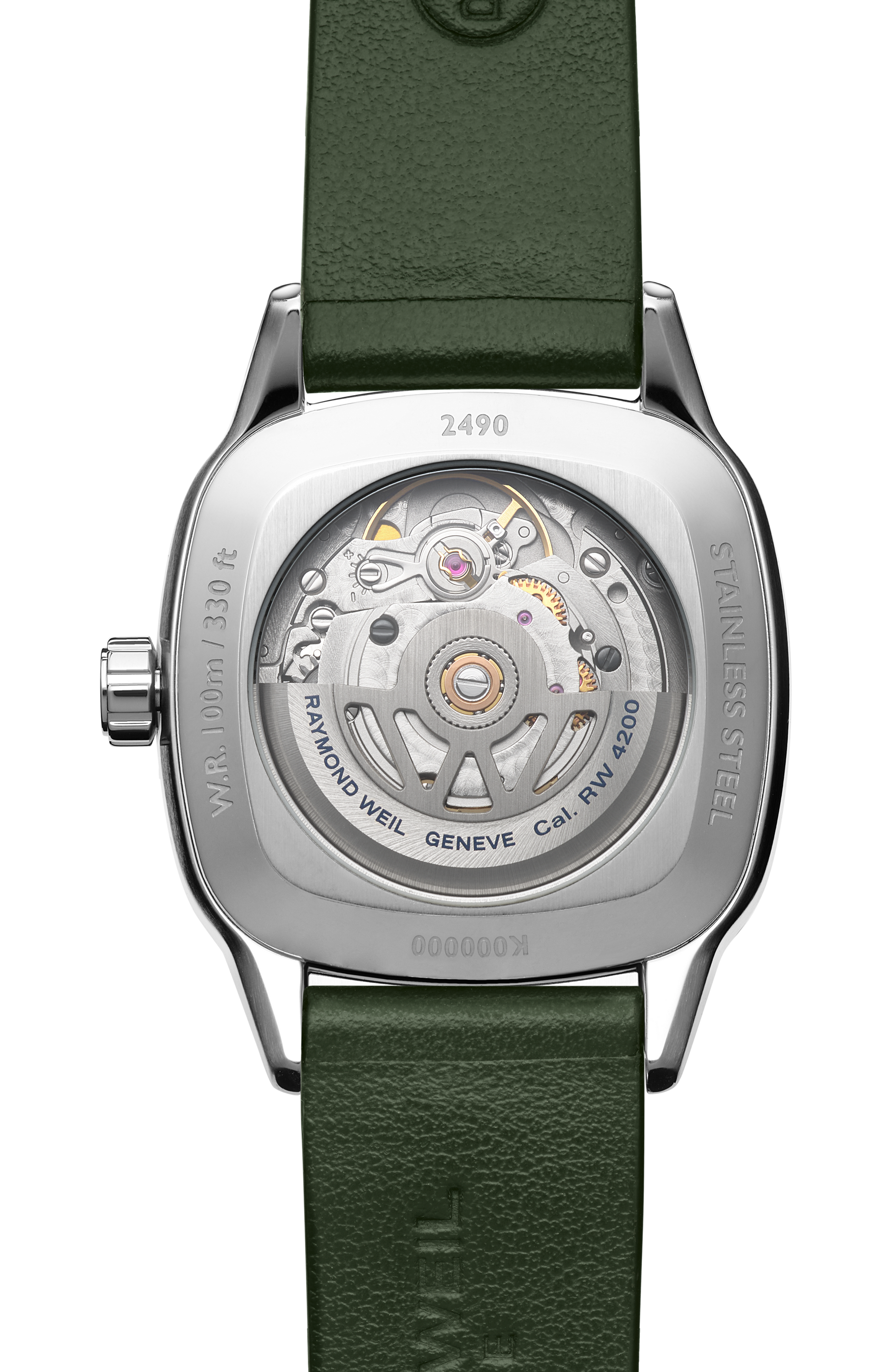 The dial's gradient green draws the eye towards the center, where a captivating W-shaped motif, as a nod to the RAYMOND WEIL brand, creates subtle shades that mesmerize the wearer