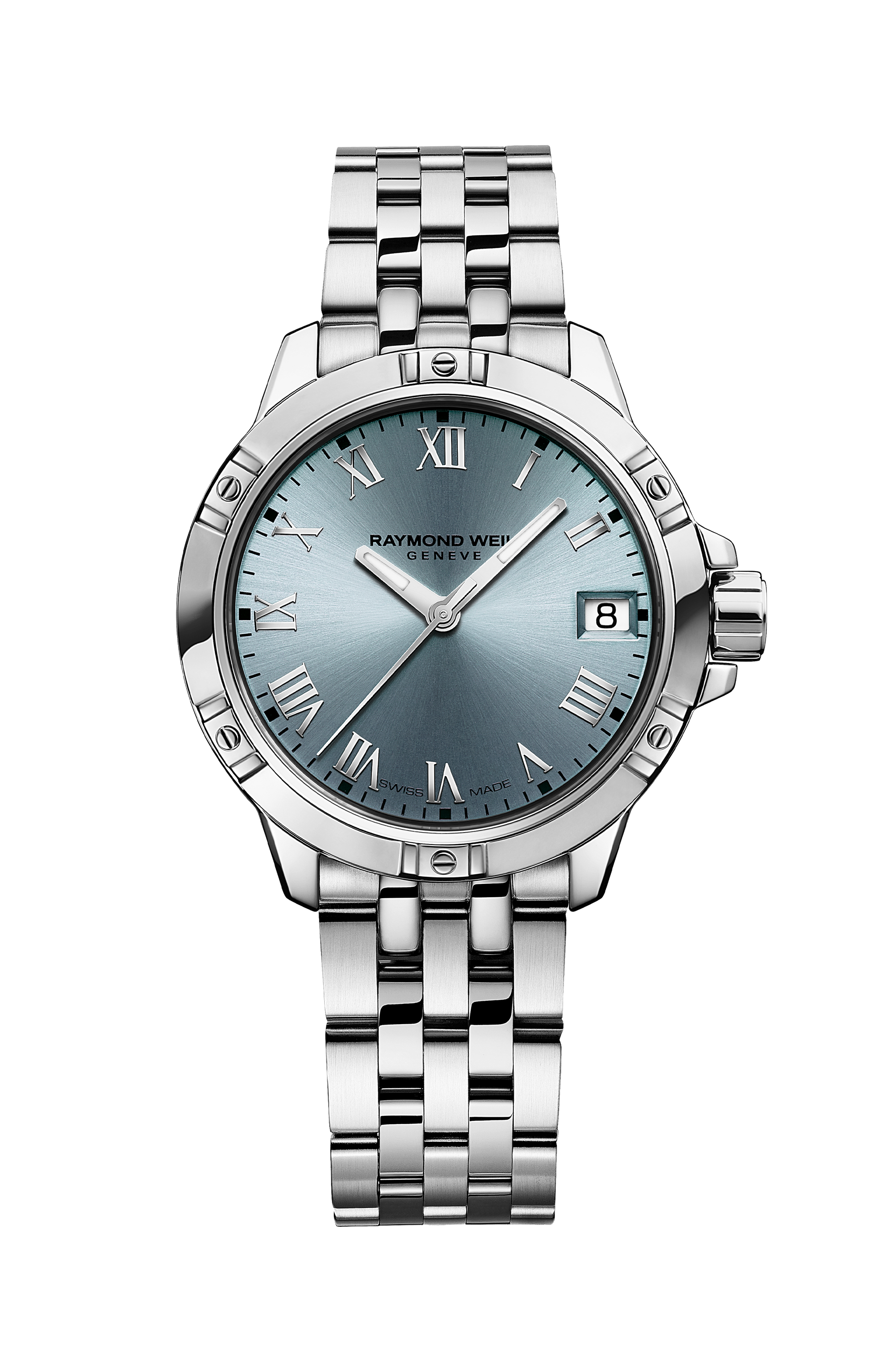 Housed in a 30 mm stainless steel case, the tango ladies' timepiece features an ergonomic 5-row stainless steel bracelet. The bezel is enlivened with six screws, each beautifully framed. Crown protectors are positioned on the right flank of the case.
