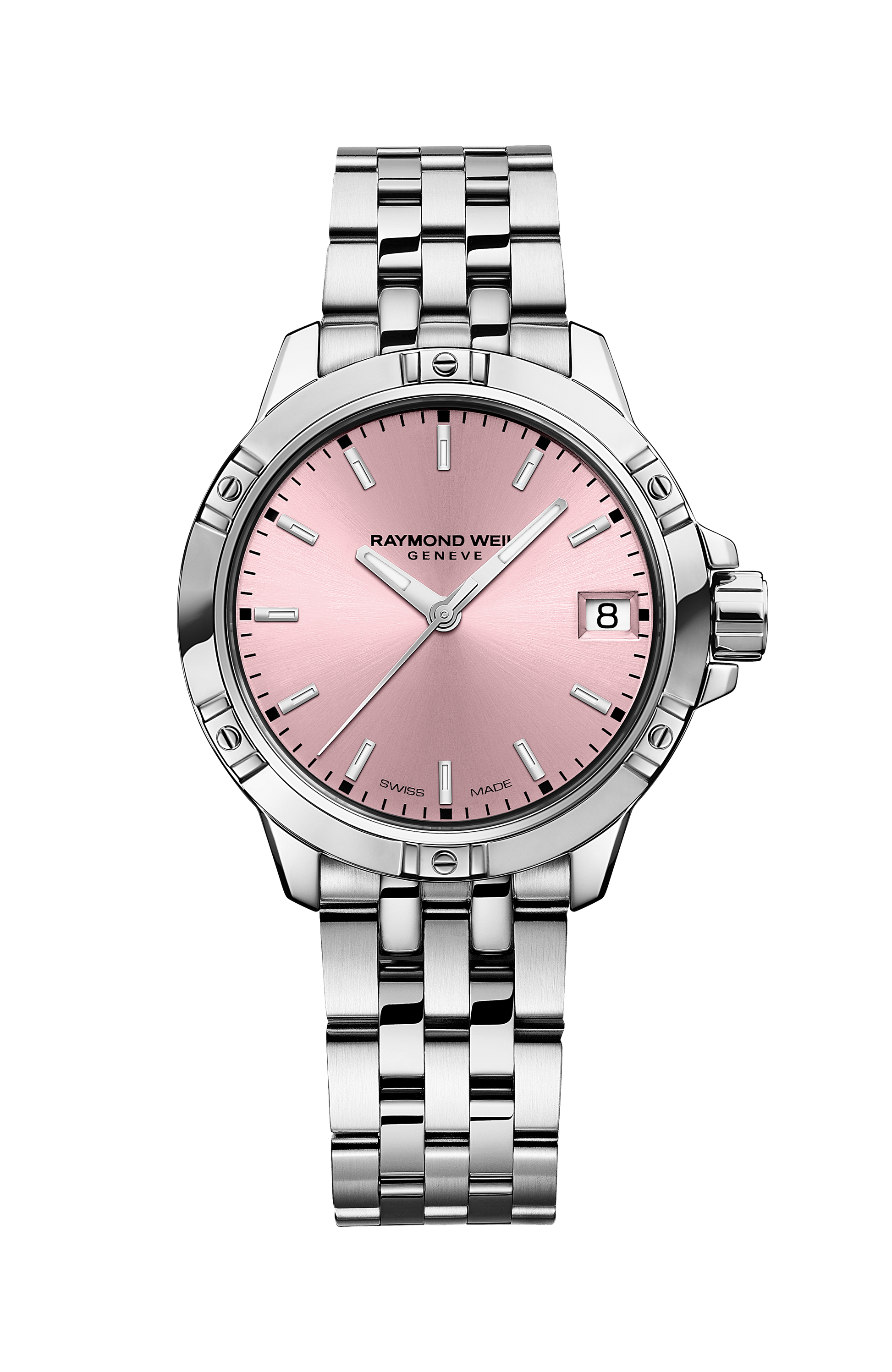 The pink dial is bright and fresh, encompassing a sunray finish as well as a date window at 3 o’clock. The hour and minute hands are treated with Super-LumiNova®, allowing for enhanced readability in restricted light. The hours are denoted with slim batons and a central seconds hand has been added for precision. The screwed-down crown, enabling water resistance up to 100m, features the RW monogram.