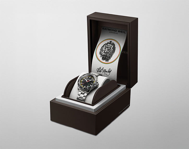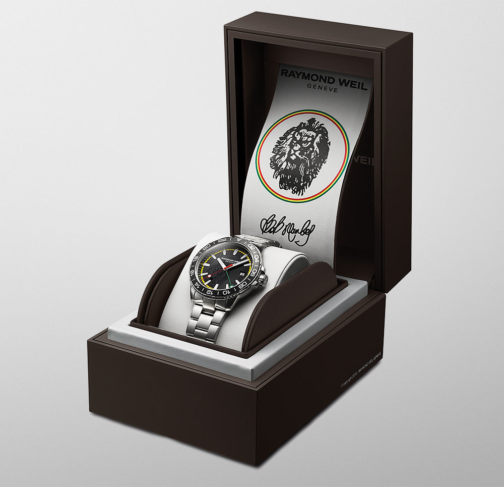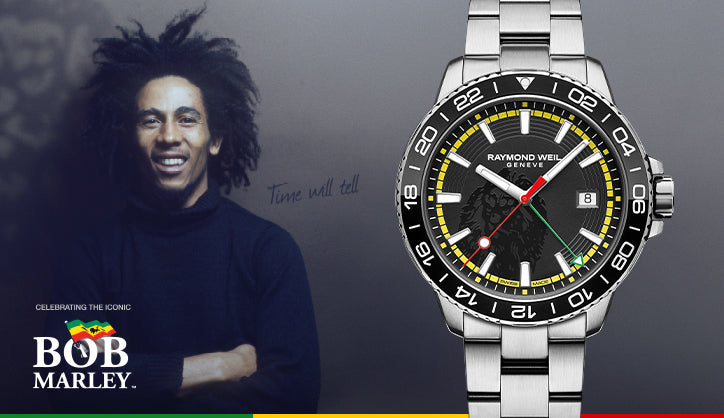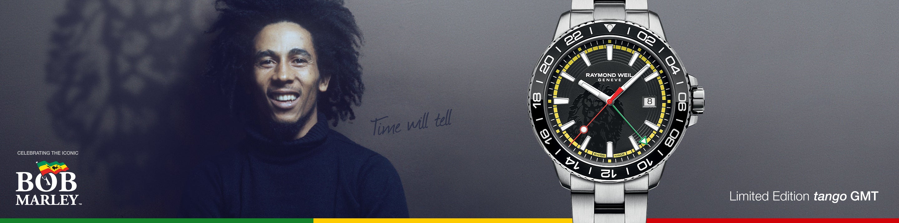 A magnificent ode to this world-class music icon, we introduce the Bob Marley tango GMT timepiece. Designed in collaboration with House of Marley, this tango limited edition has only 1,500 pieces available worldwide. The watch was inspired by the colors of the Ethiopian flag and Bob Marley’s successful title “Time Will Tell” from Kaya Album.