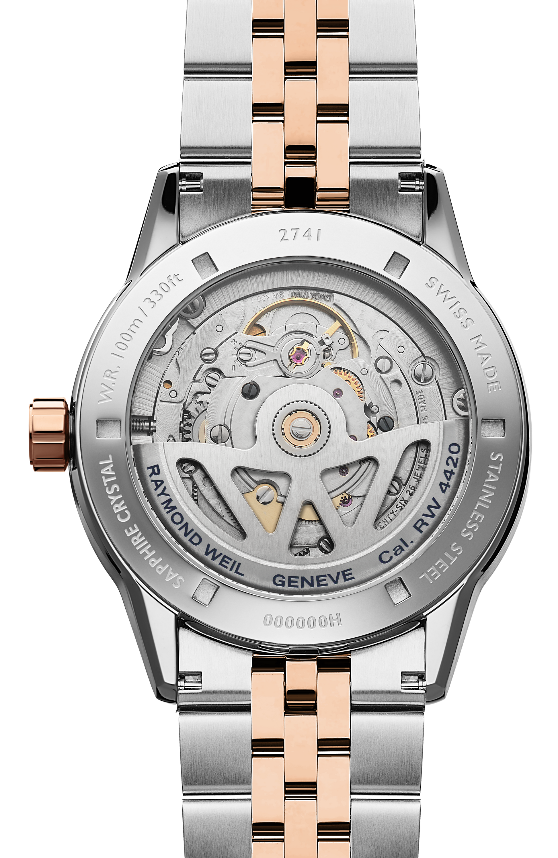 Le bracelet bicolore, doté d’une boucle déployante à double poussoir, assure confort et sécurité. La couronne vissée ornée du monogramme RW et le fond de boîte transparent en saphir révèlent le mouvement automatique, mettant en valeur la masse oscillante en forme de W, signature distinctive de RAYMOND WEIL. Étanche jusqu’à 100 mètres, cette montre allie performance et élégance.