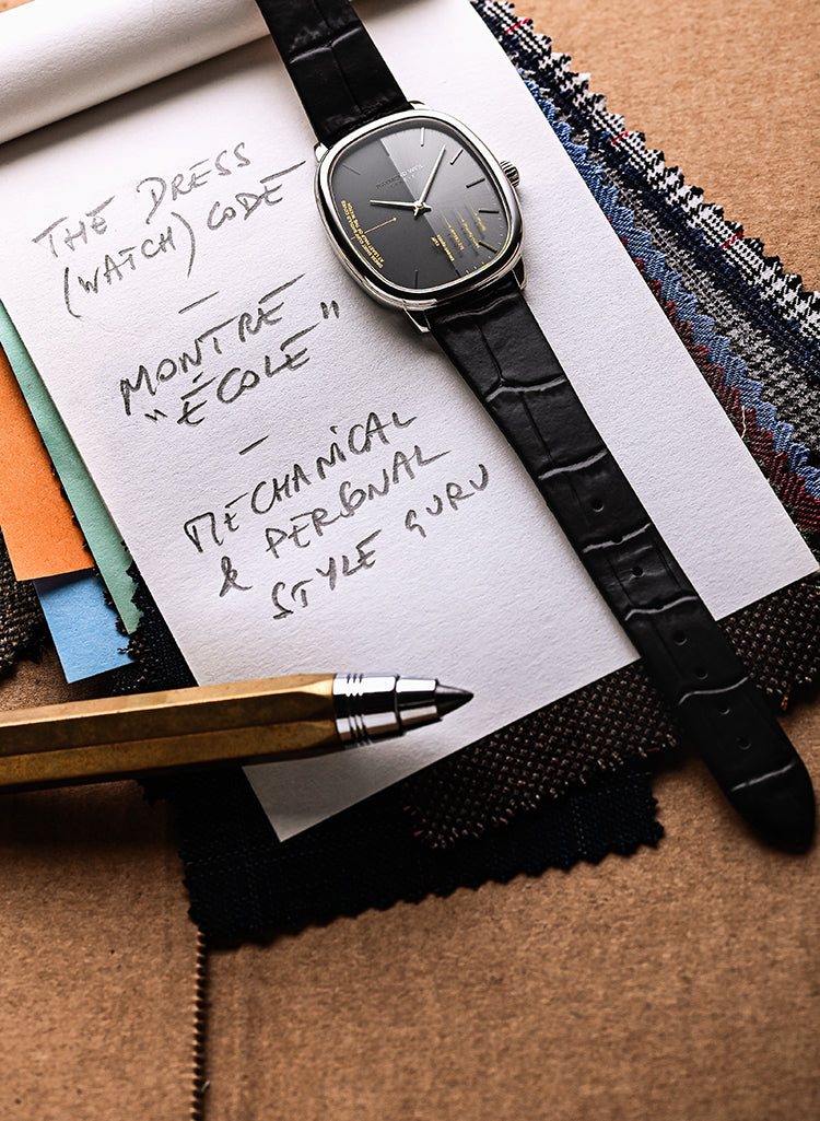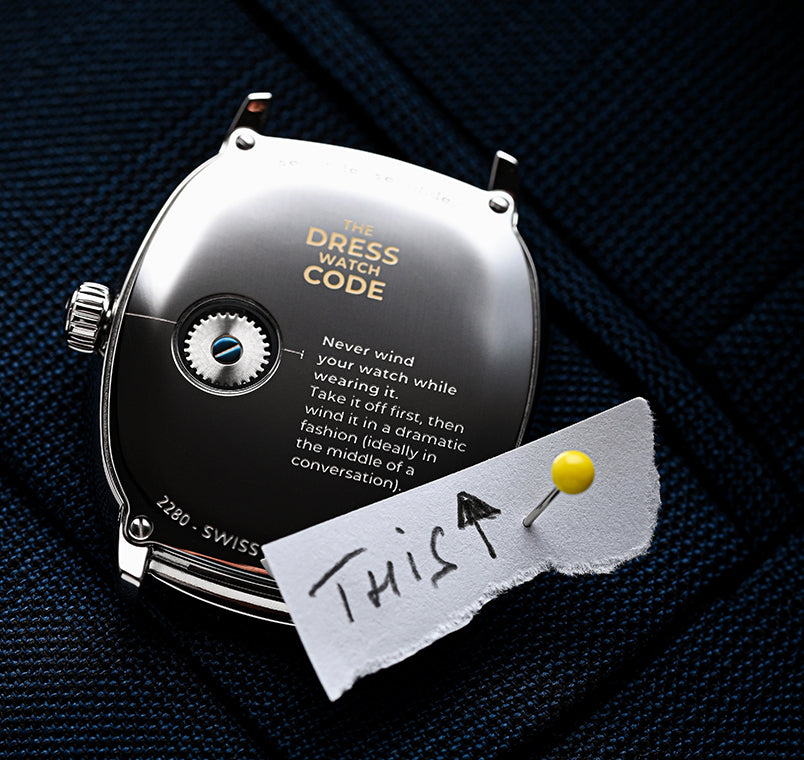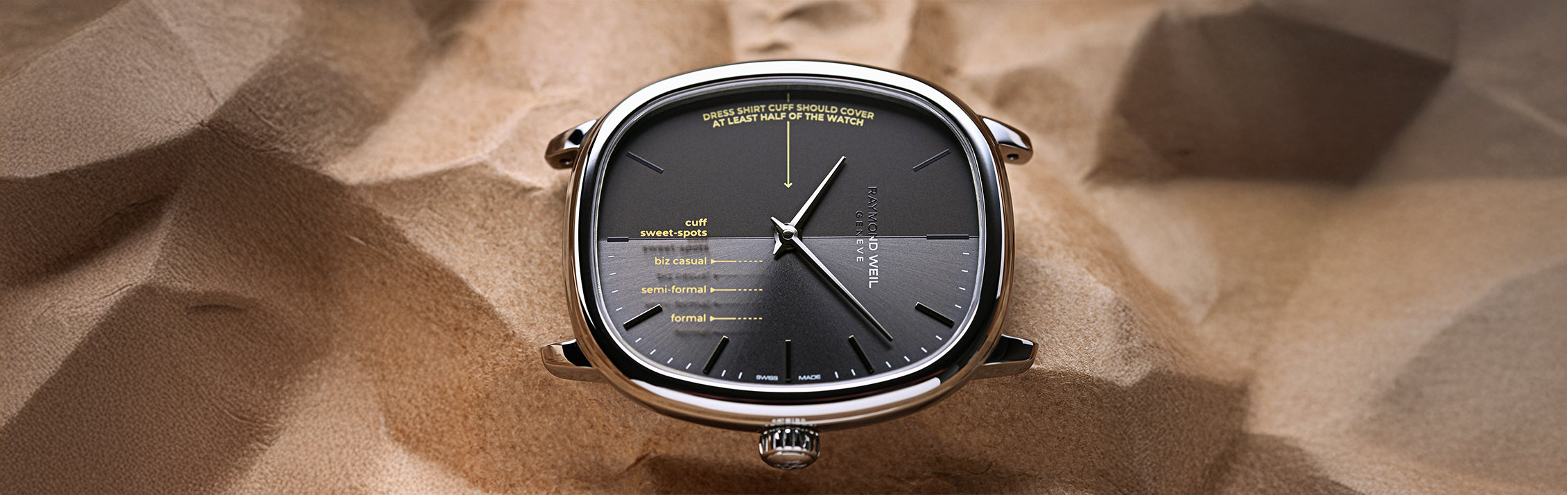 At 9 o’clock, a yellow inscription sets the tone, or rather, the rule: “Dress shirt cuff should cover at least half of the watch.”