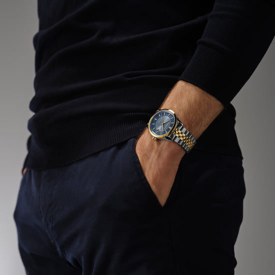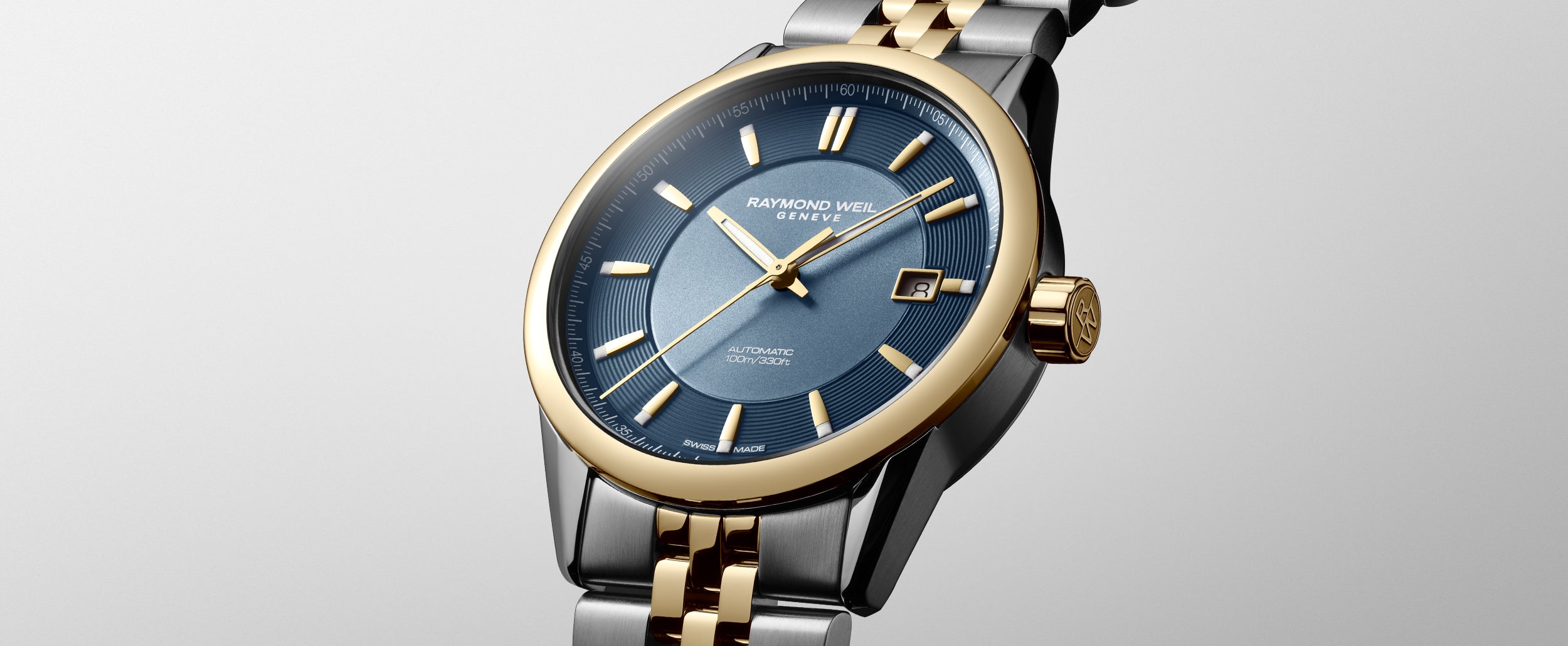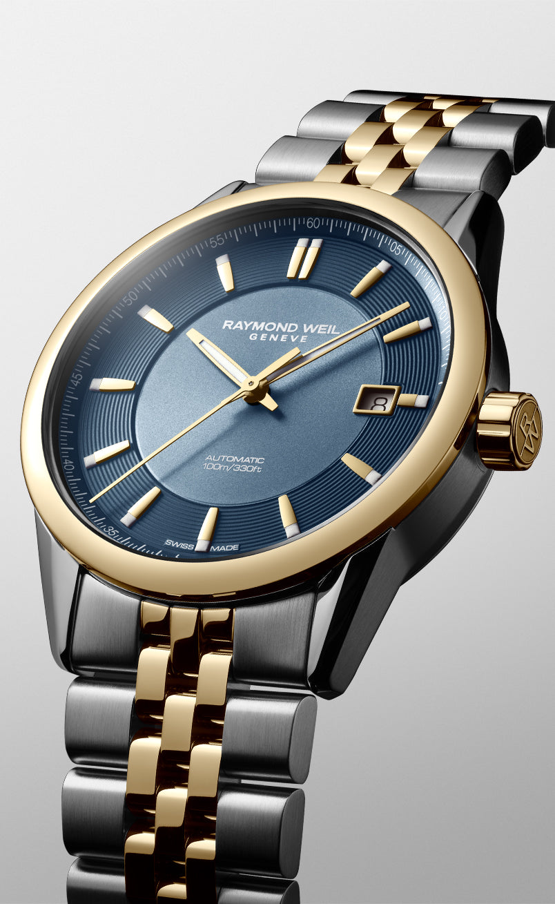 Equipped with an automatic winding movement housed in a 38 mm case, this timepiece features a captivating and elegant sunrayed blue dial with a date function at 3 o’clock. The two-tone stainless steel bracelet is equipped with a double-push security system folding clasp and the screw down crown is embossed with the RW monogram for a touch of refinement. The decorated Swiss-made automatic movement can be seen through the transparent sapphire crystal case back. Perfect balance of tradition and modernity, the freelancer automatic collection showcases RAYMOND WEIL’s unwavering dedication to craftsmanship and artistic expression. Launched in 2007, the freelancer collection was created in honor of the free-spirit who wishes to remain in control of there own destiny, and features an eclectic mix of urbane mechanical watches. This freelancer mixes classic and modest to create a harmonious and unique design. Constantly reinterpreting itself and free from all constraints, the freelancer conserves those elements which constitute its strengths.
