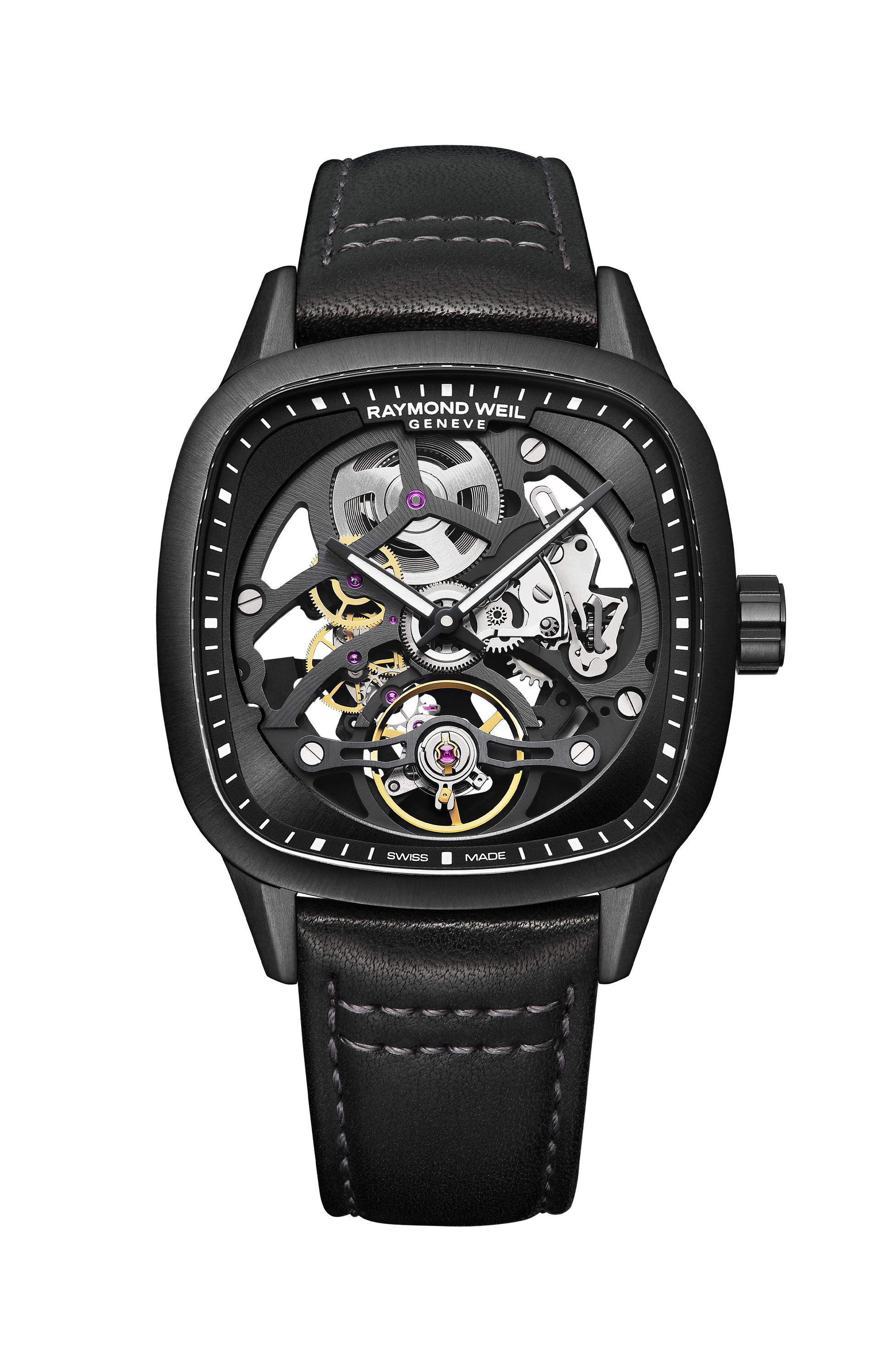 Framed by a 40 x 40 mm black PVD-coated stainless steel cushion-shaped case, the freelancer Calibre RW1212 Skeleton embodies RAYMOND WEIL’s commitment to innovation and watchmaking excellence.