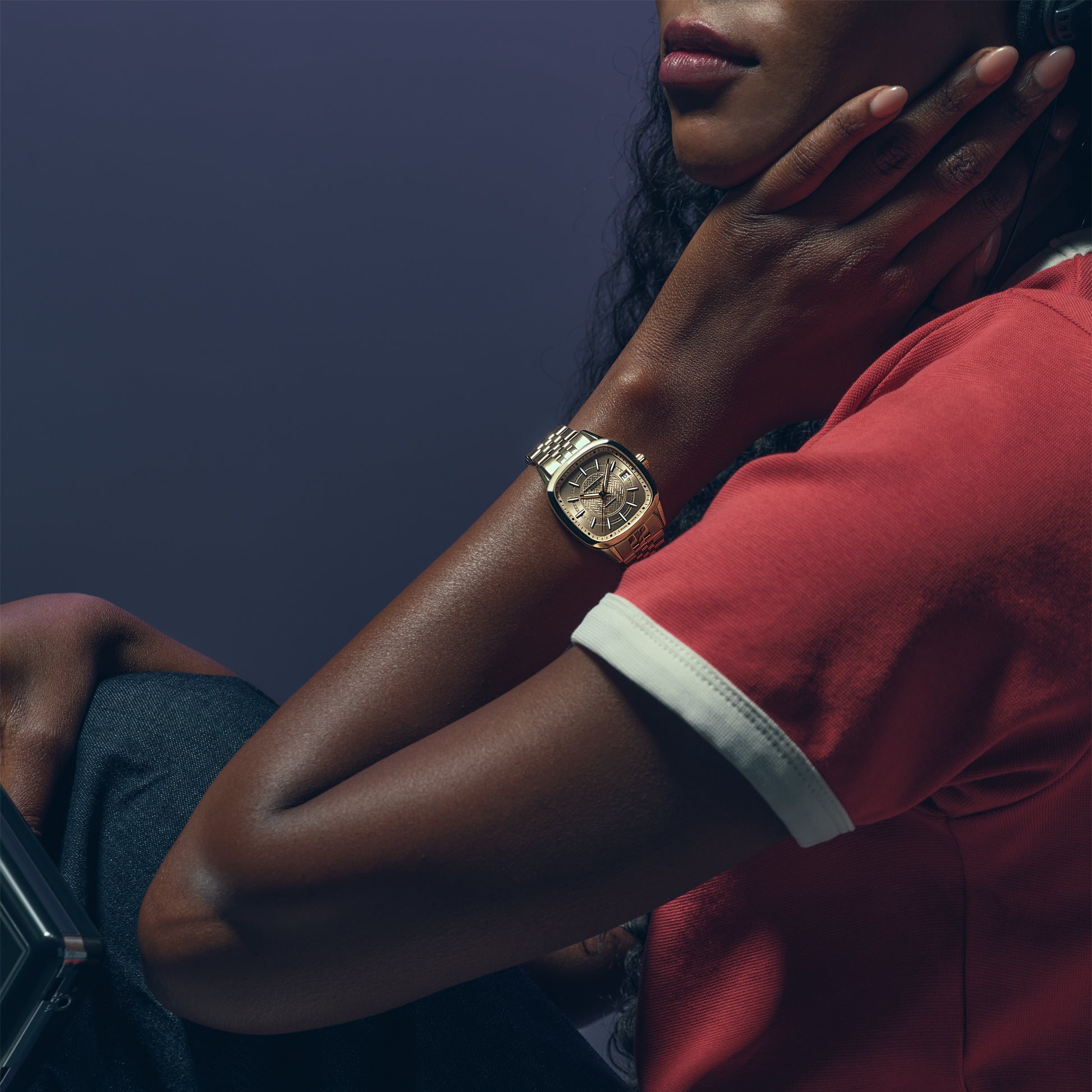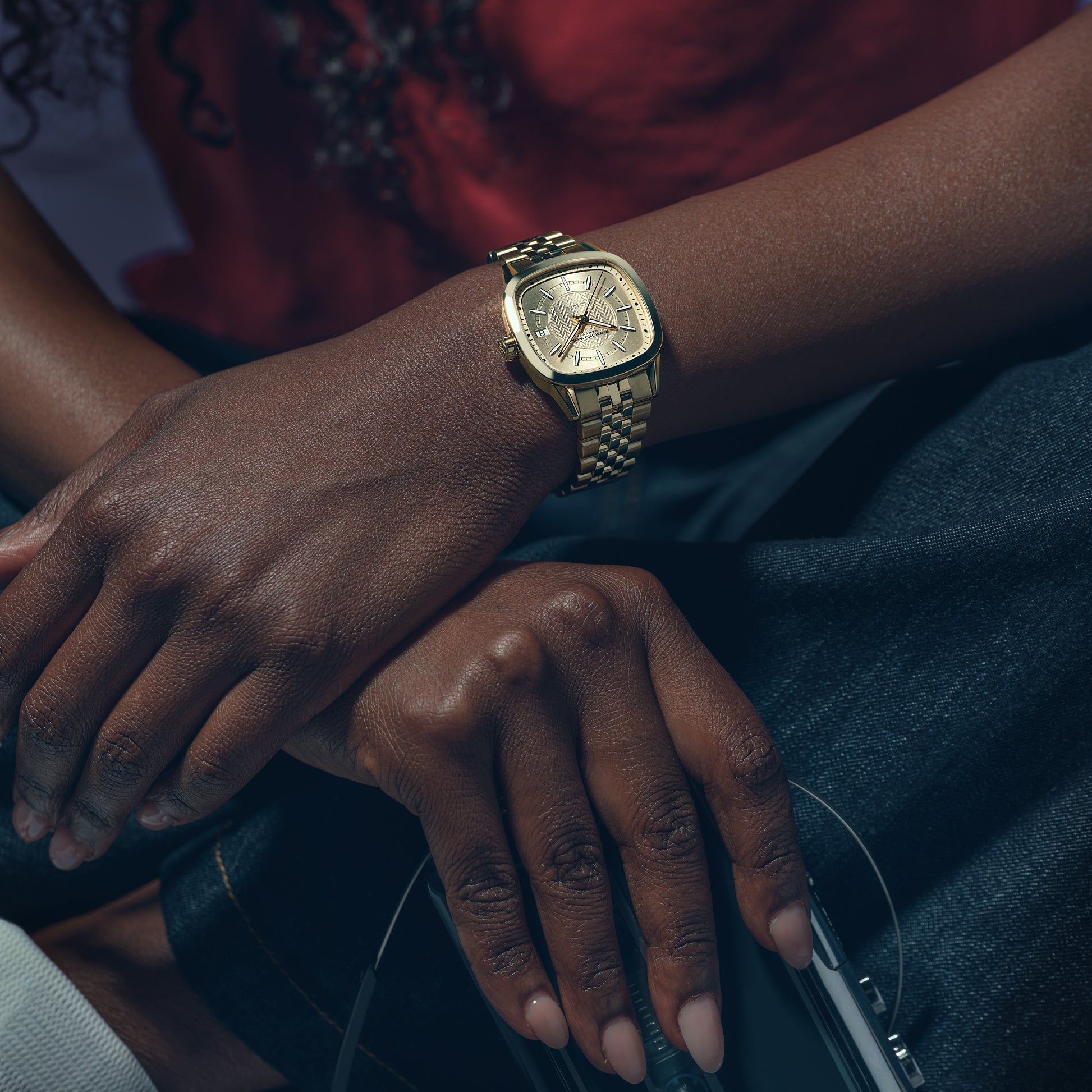 The dial’s champagne draws the eye towards the center, where a captivating W-shaped motif, as a nod to the RAYMOND WEIL brand, creates subtle shades that mesmerize the wearer