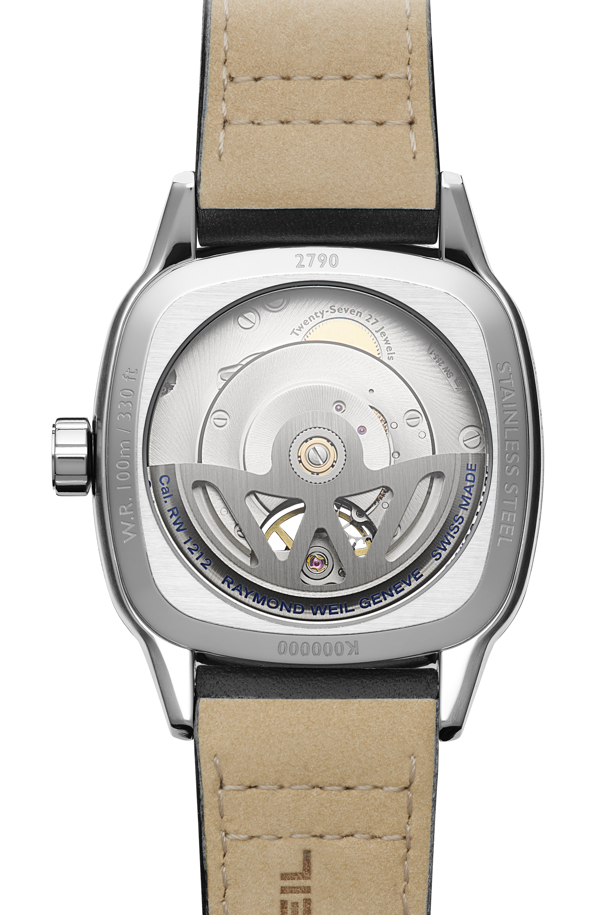 On the gradient dial, the Swiss-made automatic movement reveals itself through an open worked bridge. The Calibre RW1212 and the W-shaped oscillating weight, as a nod to the RAYMOND WEIL brand, can be admired through the exhibition caseback.