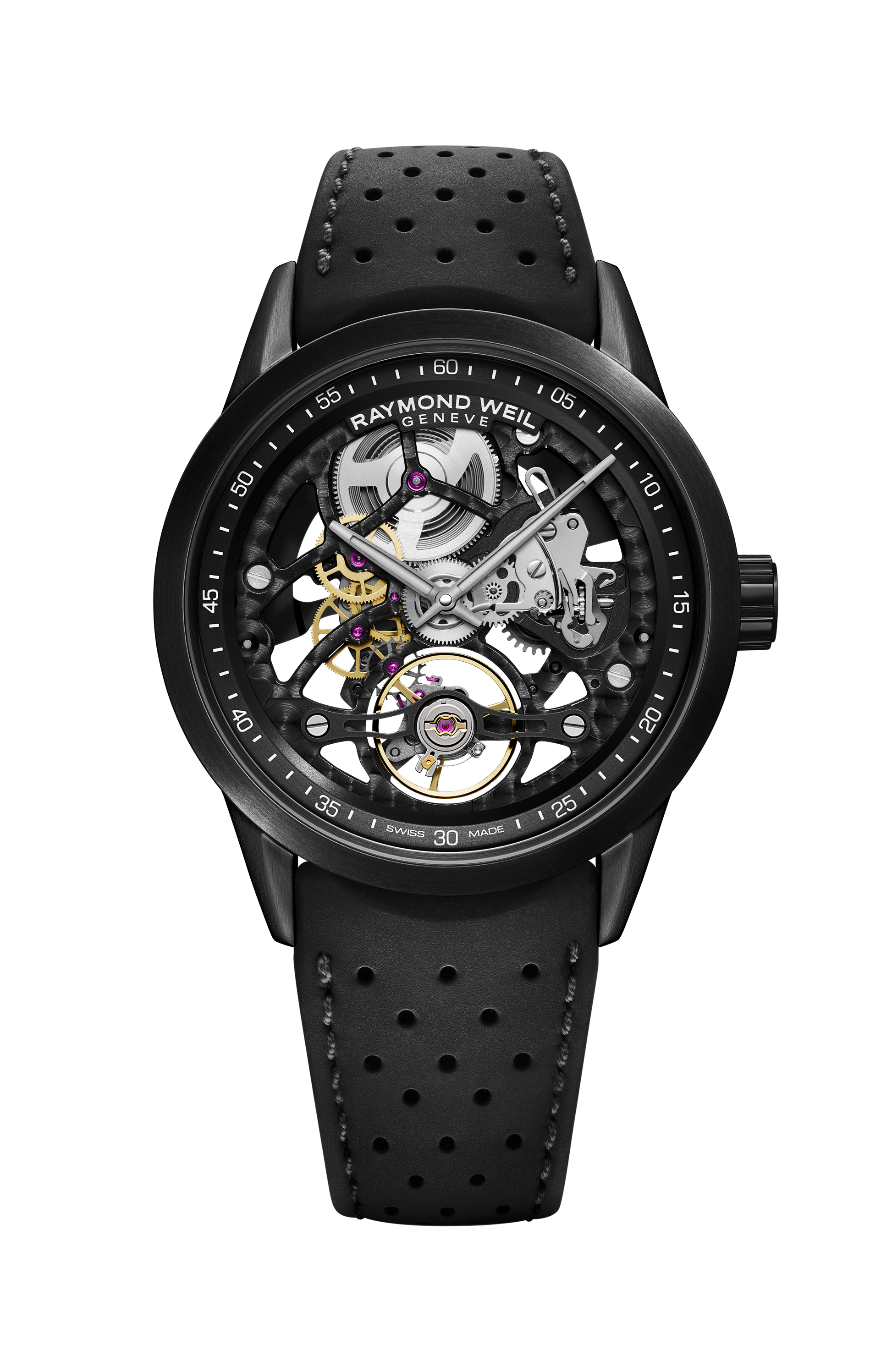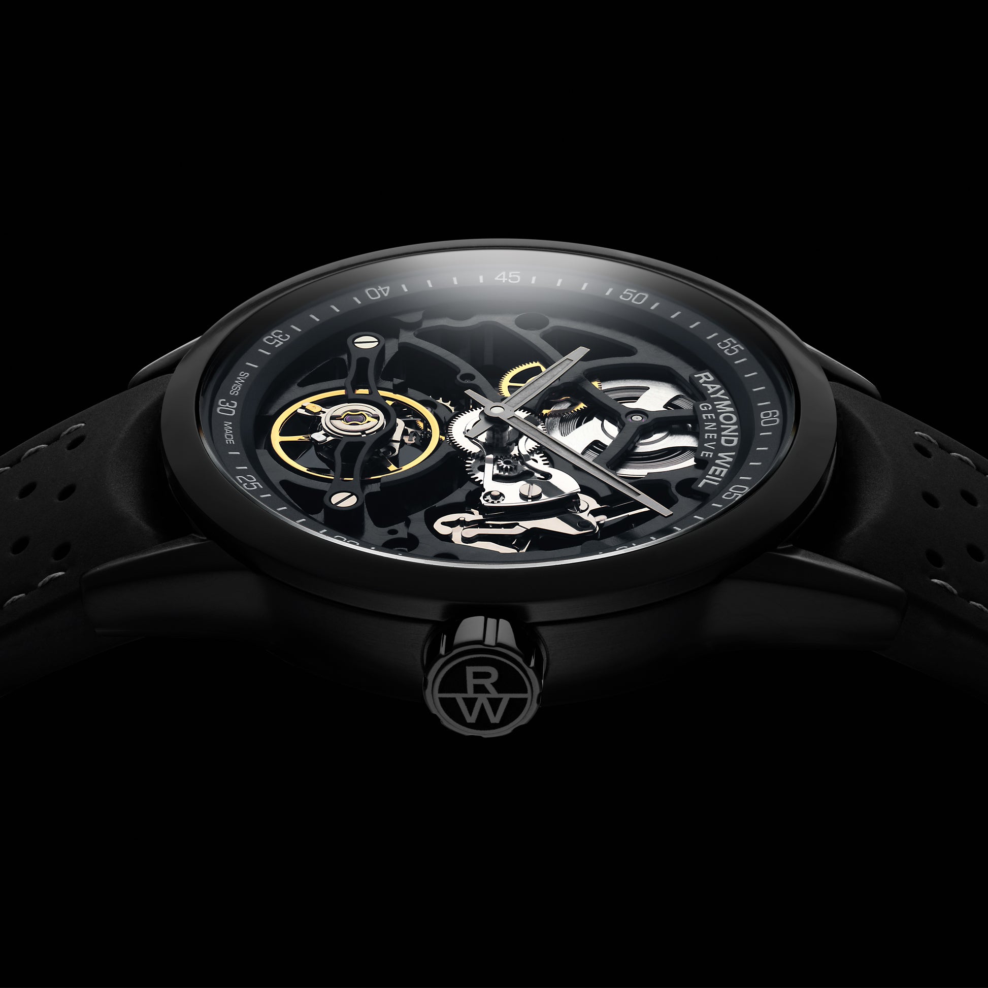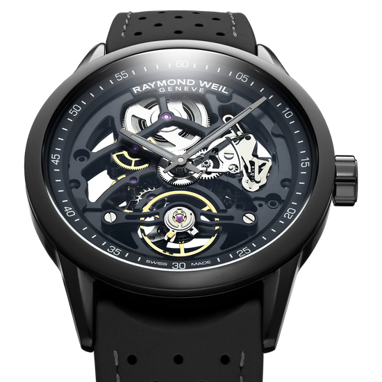 RAYMOND WEIL asserts its ambition for innovation with the dial completely opened, offering a view of the balance wheel at 6 o'clock and exposing the manufacturing beauty, and highlighting the richness of watchmaking expertise. The black rubber strap offers modernity and urban style to this exclusive timepiece. The new stylish skeleton Calibre RW1212 is proof of the ever-evolving achievements to these in-house movements.