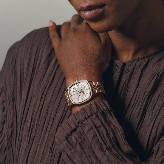 The next evolution of the freelancer automatic collection is a new interpretation of the form watch, that elegantly transcends convention. This model has been reimagined for the modern individual, fusing a cushion-shaped design with signature brand details that radiate contemporary sophistication. Measuring a 34 x 34 mm diameter, the freelancer ladies automatic has a square, cushion-shaped housing and features an automatic Swiss-made movement, with a 41 hours power reserve, ideally suited to daily wear. This model features luminescent hour and minute hands with matching indexes, a fine centre seconds hand and a date indication at 3 o’clock.