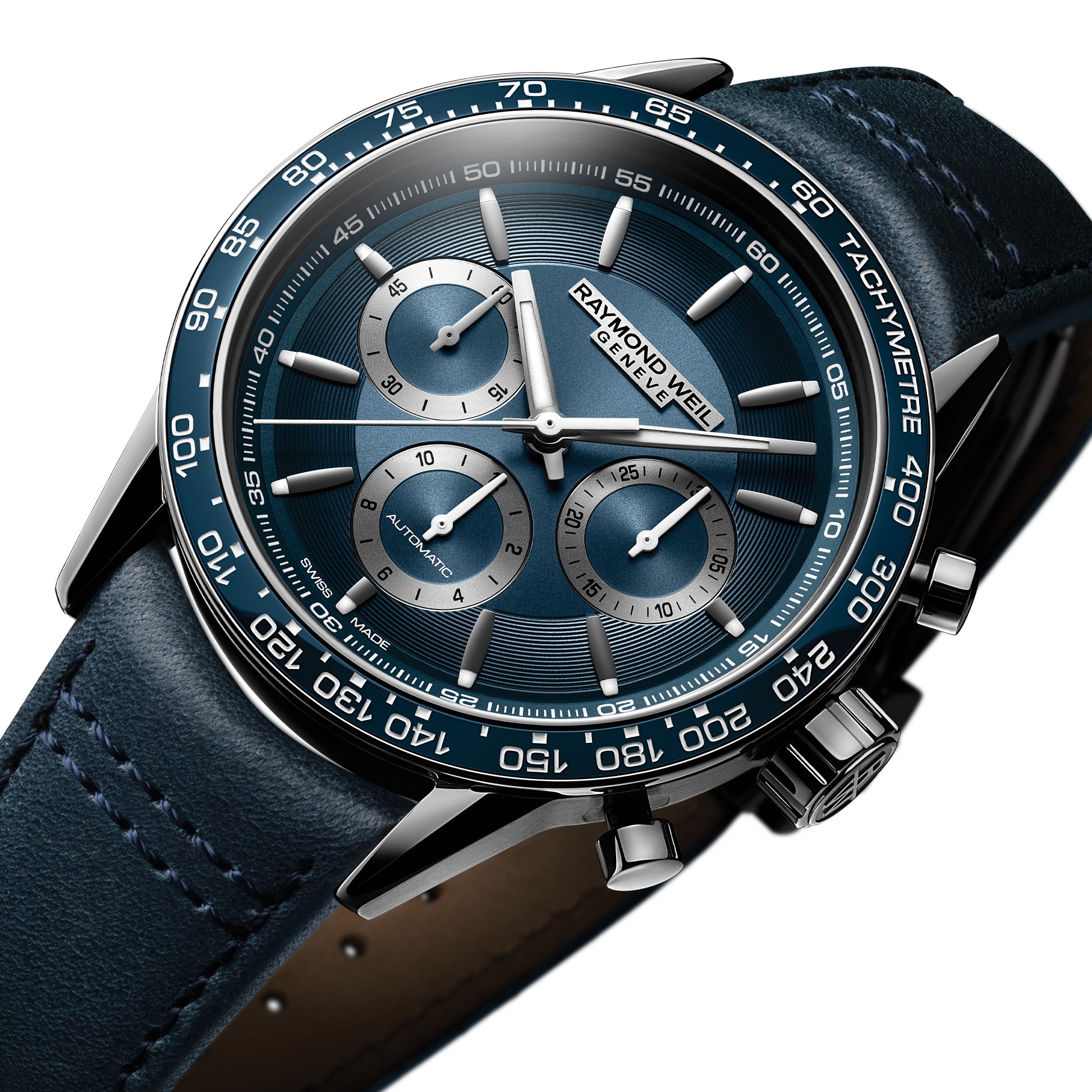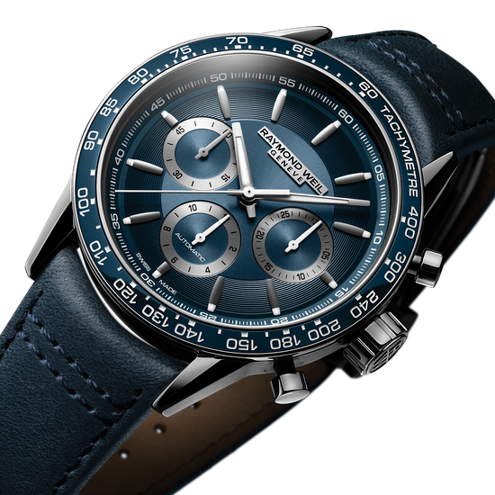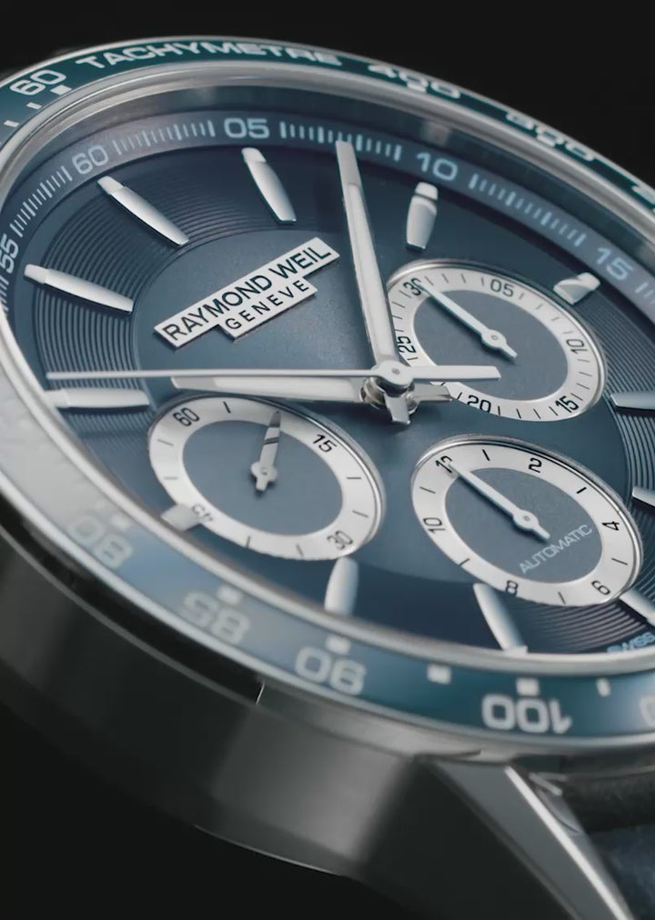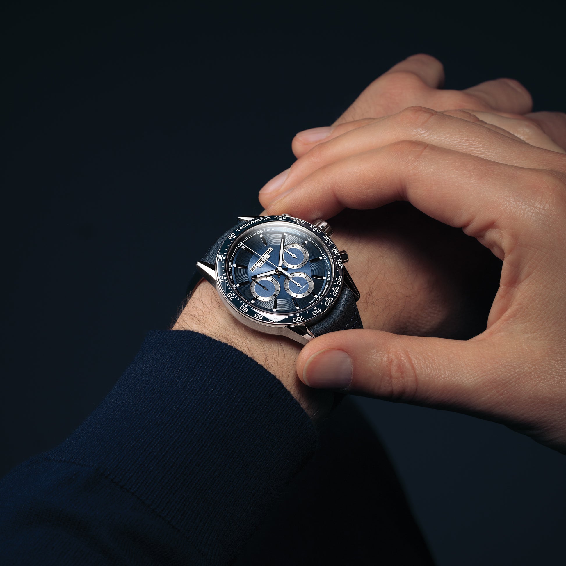 The 43.5 mm stainless steel case encompasses a combination of brushed and polished surfaces and is attached to a genuine calf leather strap. Both the hands and indexes are lined with luminescent treatment, aiding readability in restricted light. Featuring a blue scratch-resistant ceramic inlay, marked with a tachymeter scale, the bezel contributes to the refined and luxurious feel of the timepiece. Enhancing the model’s appearance, the dial is slightly smoked with a snailed hour track and the counters are framed with silver-toned circlets.