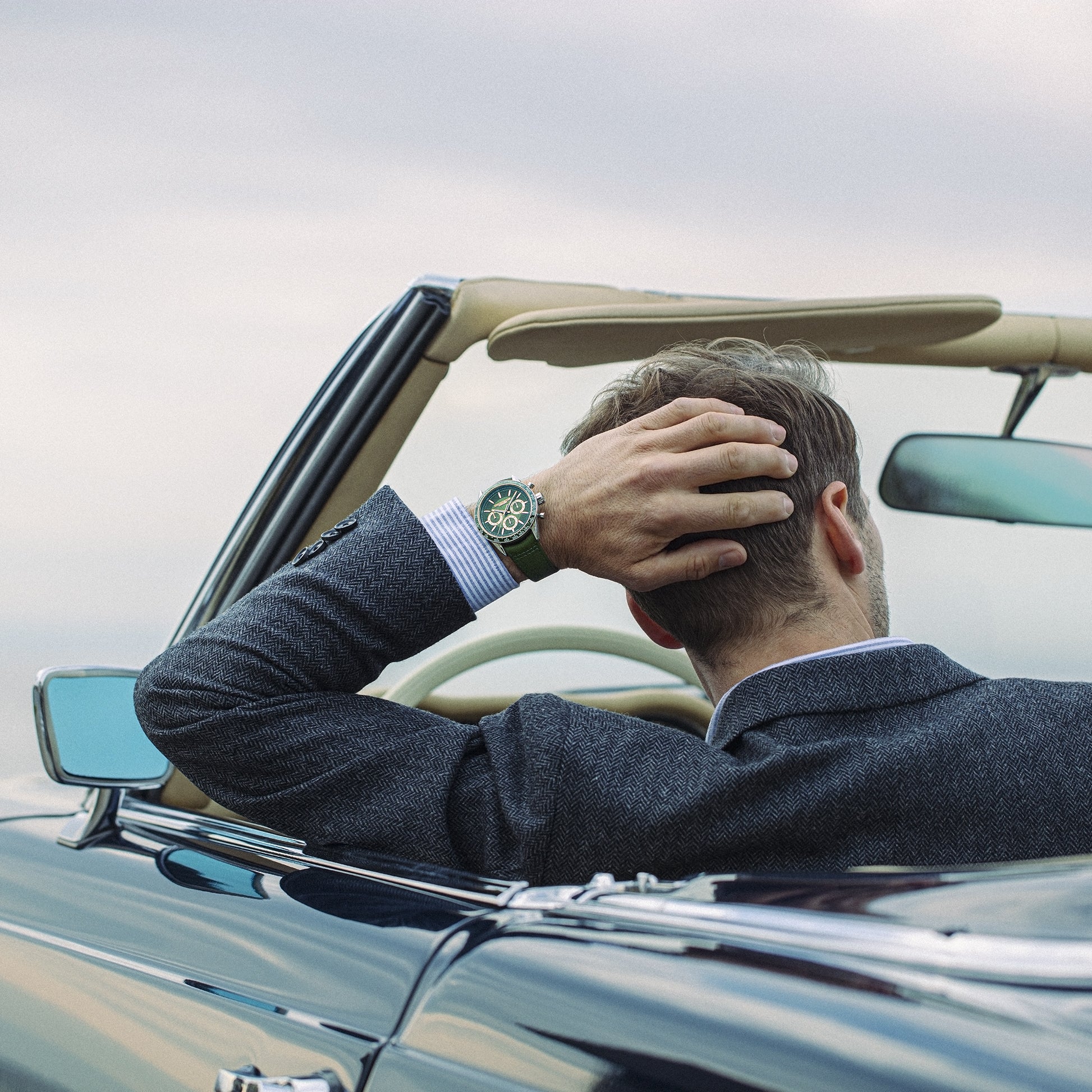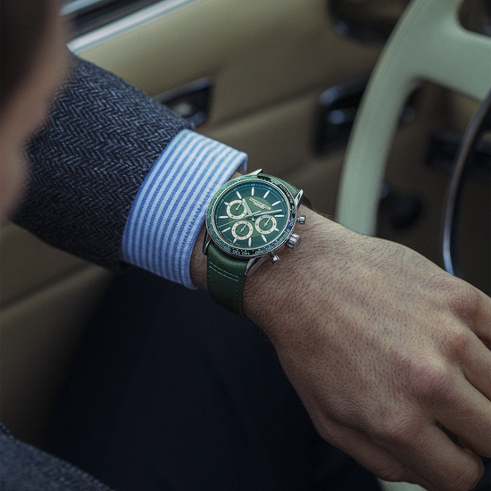 • Case Material: Round – Stainless steel with green ceramic tachymeter bezel