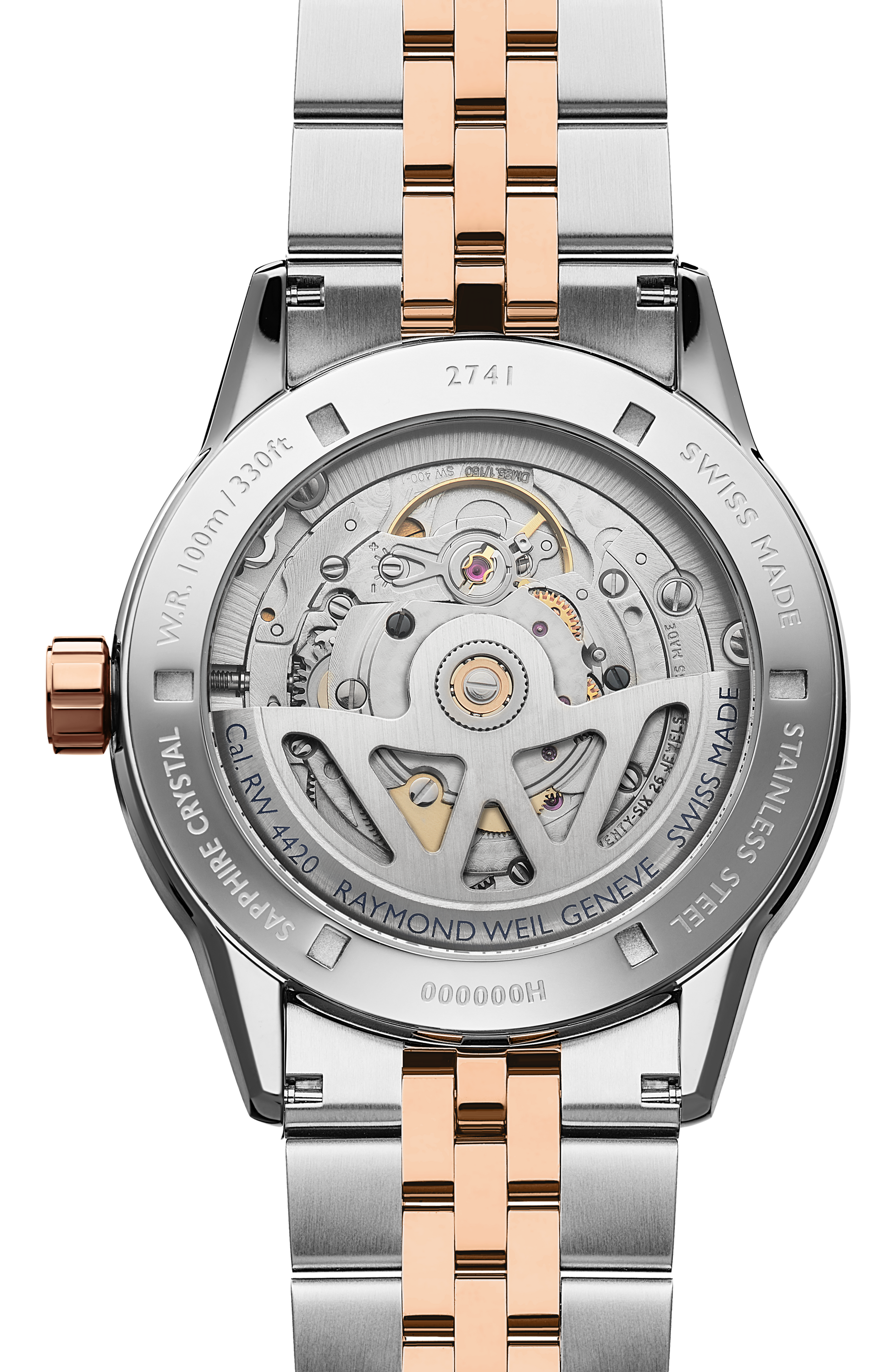 The two-tone bracelet, fitted with a double-push folding clasp, offers both comfort and security. A screwed-down crown embossed with the RW monogram and a transparent sapphire caseback reveal the automatic movement within, showcasing the W-shaped oscillating weight—a distinctive signature of the brand. Water-resistant up to 100 meters, this timepiece embodies both performance and elegance.