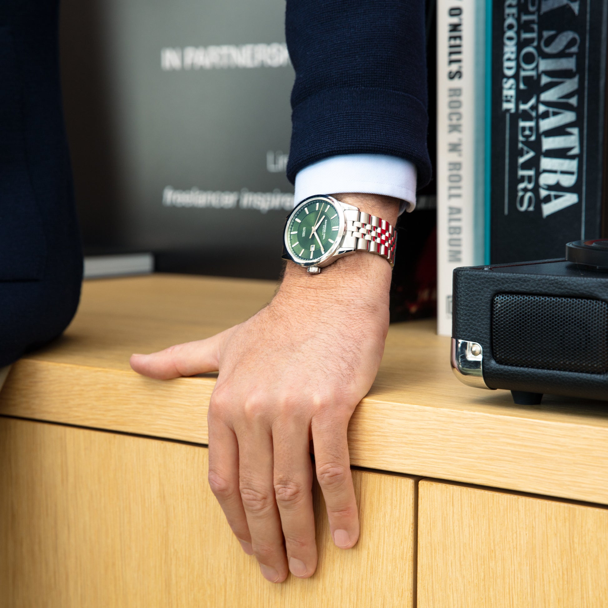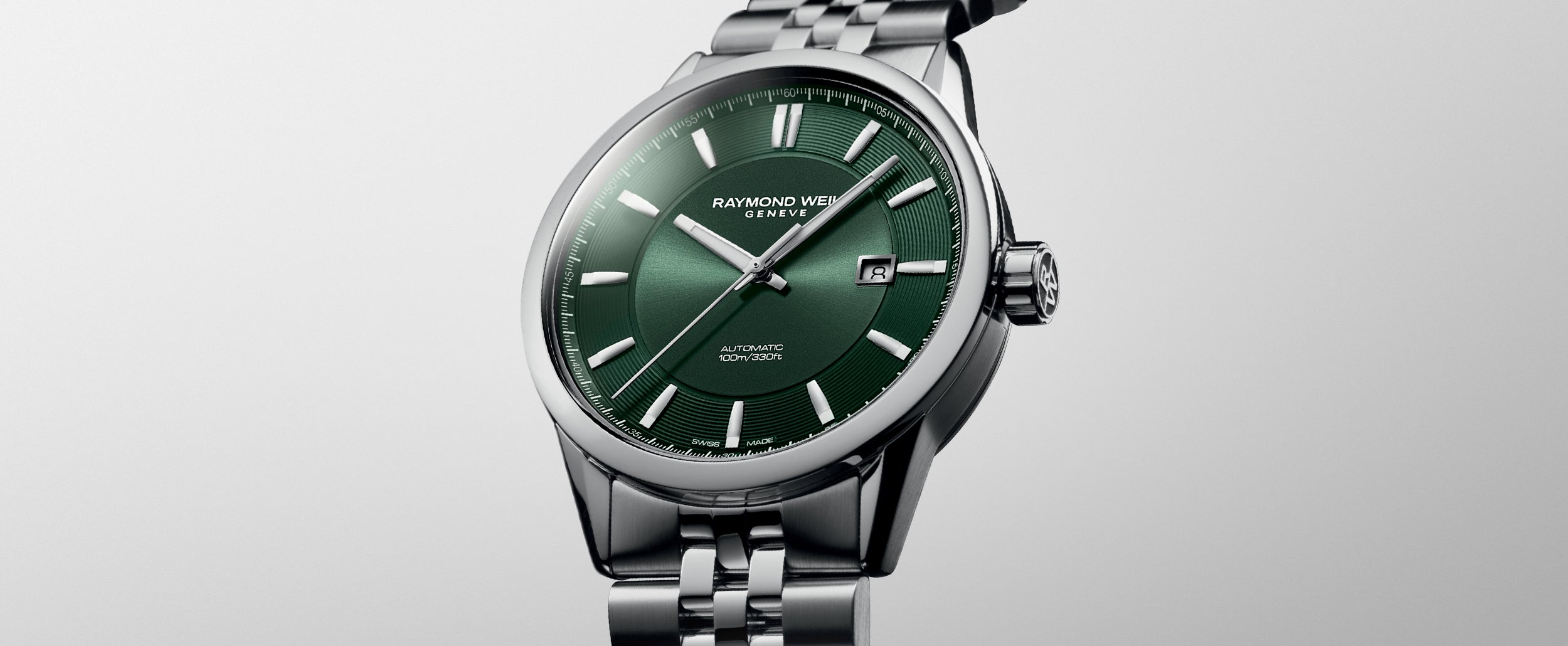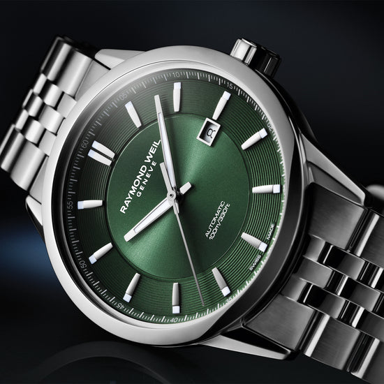 Equipped with an automatic winding movement housed in a 42 mm case, this timepiece features a captivating and elegant green dial with a date function at 3 o’clock. The stainless steel bracelet is equipped with a double-push security system folding clasp and the screw down crown is embossed with the RW monogram for a touch of refinement. The decorated Swiss-made automatic movement can be seen through the transparent sapphire crystal case back.