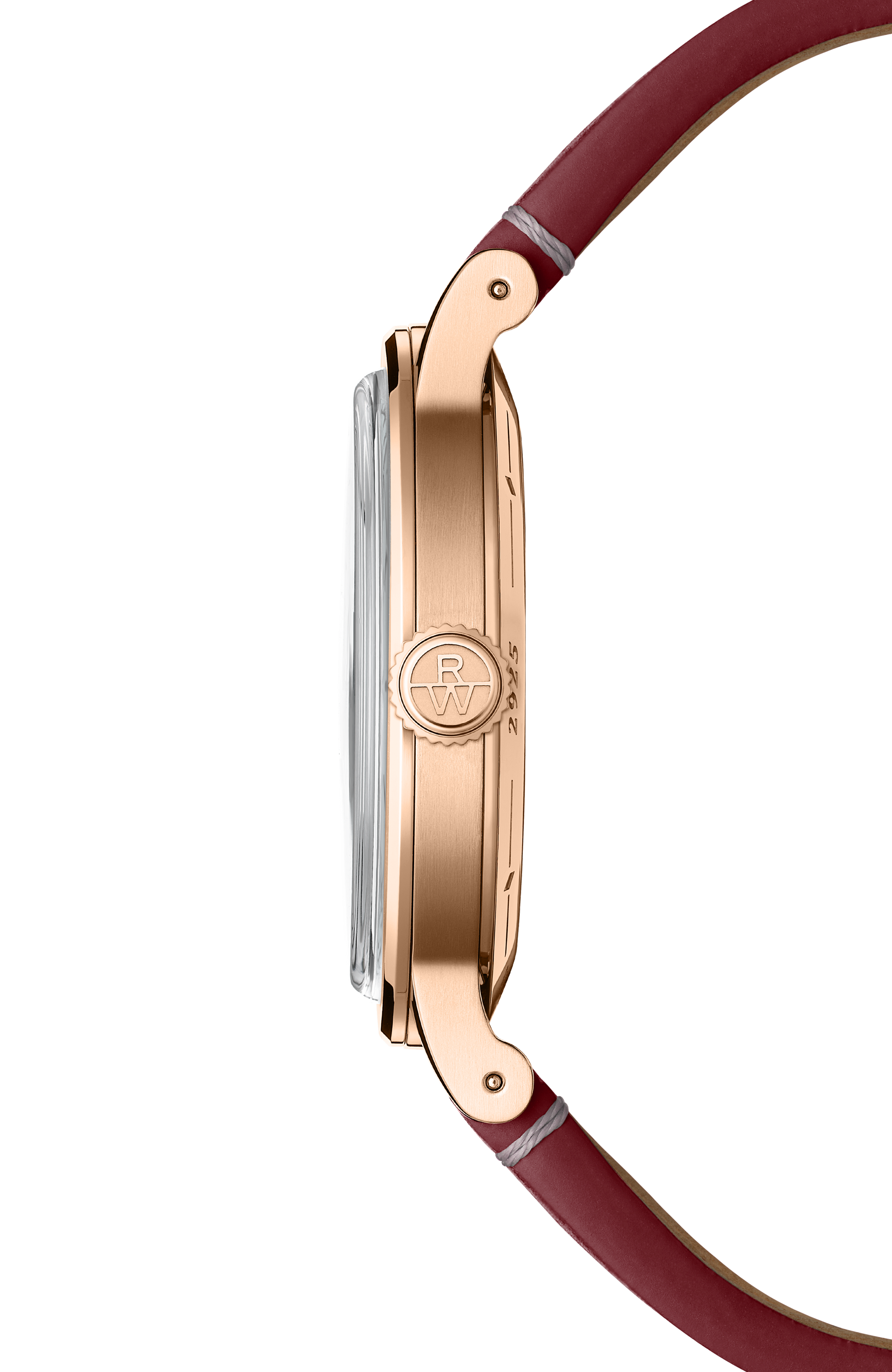 The red grape sector dial, located beneath a vintage-inspired sapphire crystal glass-box, has been refined to the highest degree. The hours and minutes are eloquently conveyed with rose gold hands, lined with Super-LumiNova®. The sector dial presents the hours, minutes and seconds periods on discrete tracks, augmenting readability.