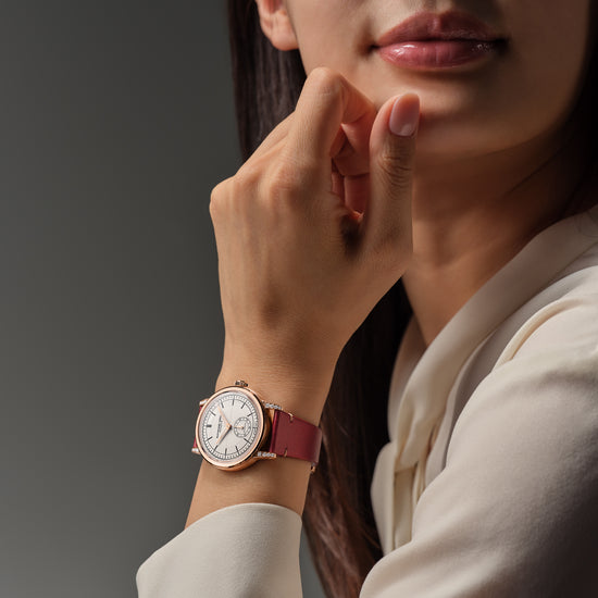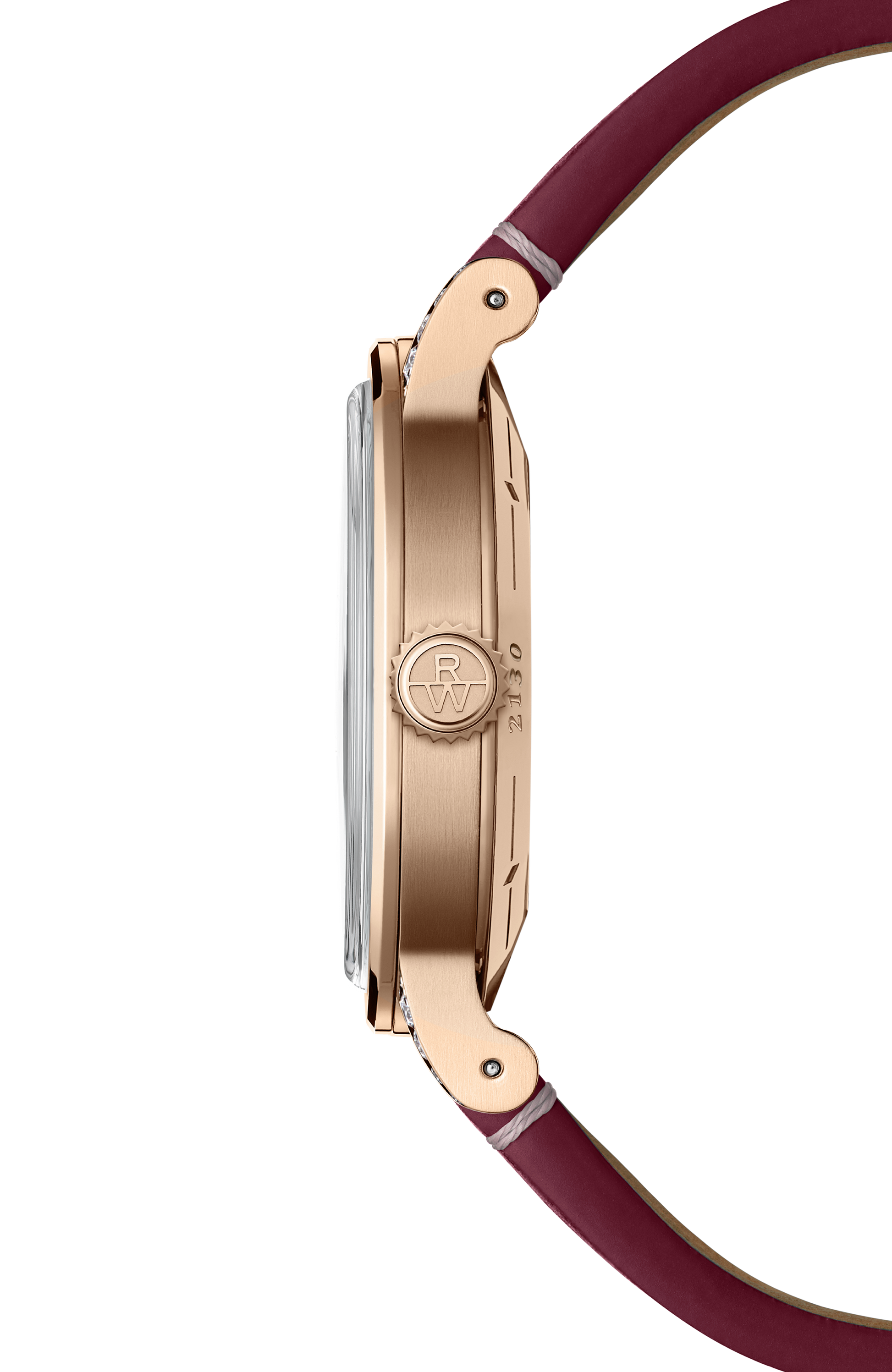 A sapphire caseback affords sight of the self-winding movement within and the “W-shaped” oscillating weight, RAYMOND WEIL’s horological signature. The red grape genuine calf leather strap is enhanced with a unique W-stitched detail.