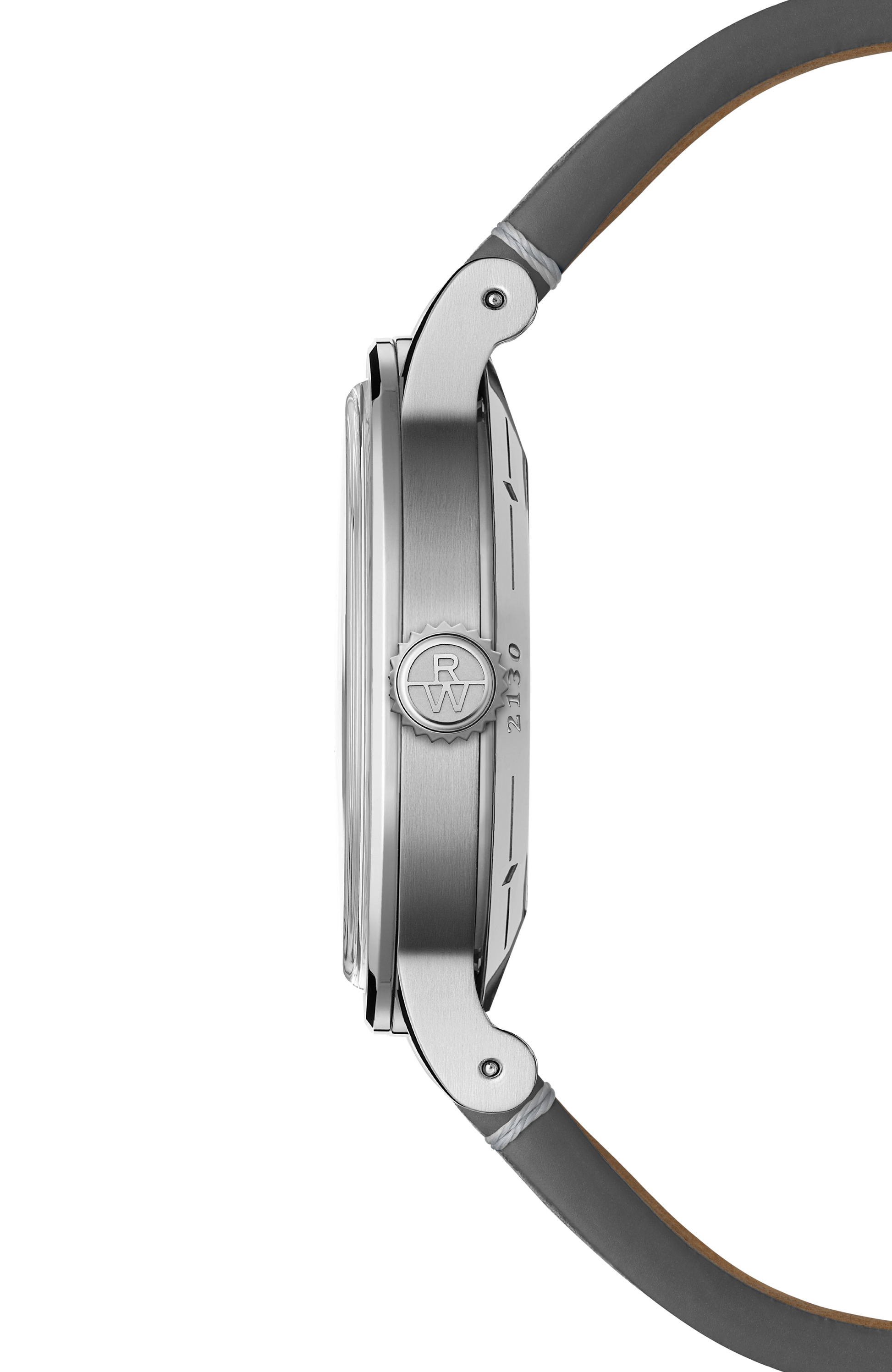 A sapphire caseback affords sight of the self-winding movement within and the “W-shaped” oscillating weight, RAYMOND WEIL’s horological signature. The grey genuine calf leather strap is enhanced with a unique W-stitched detail.