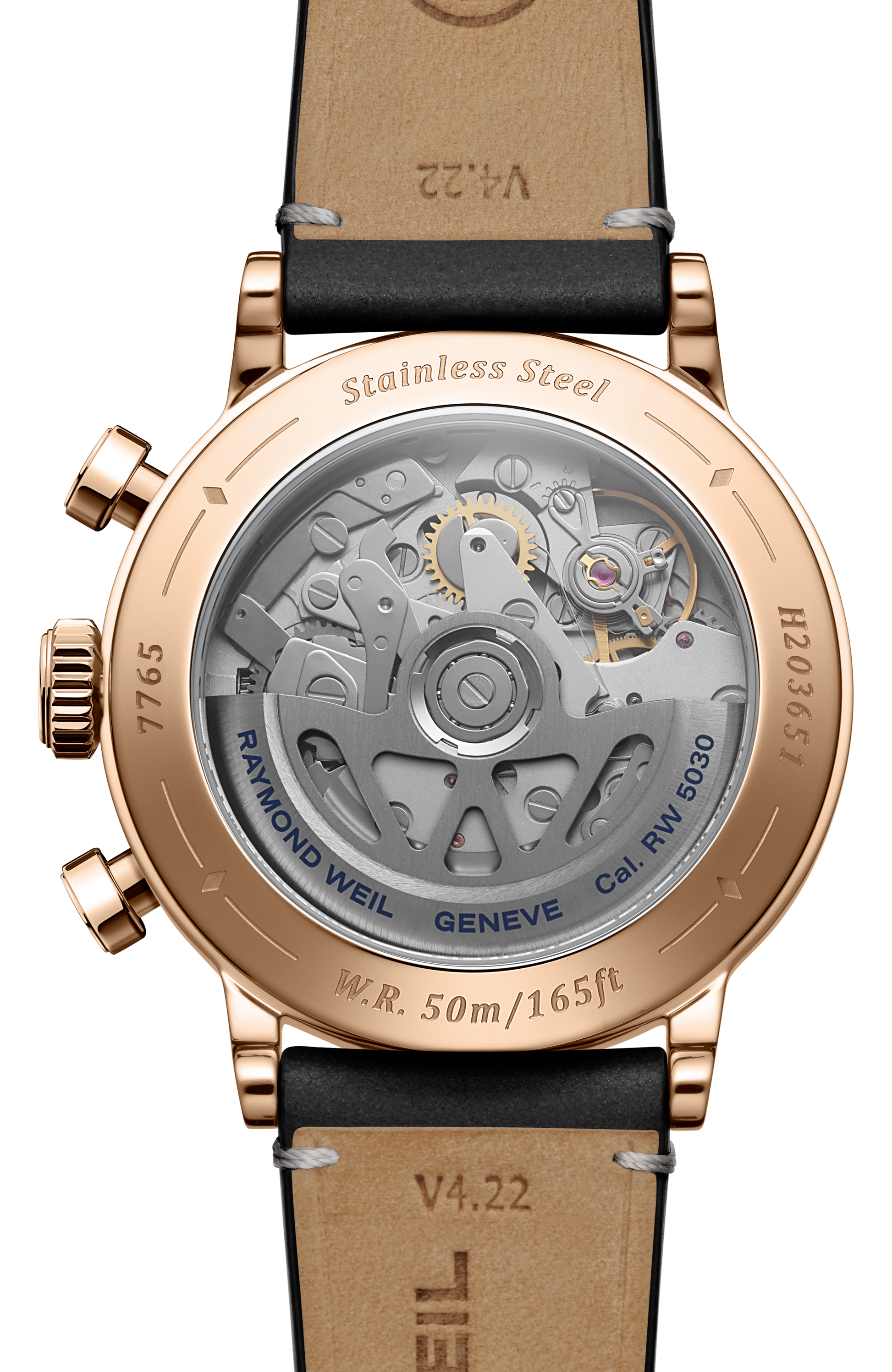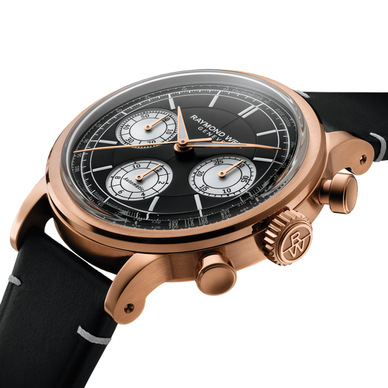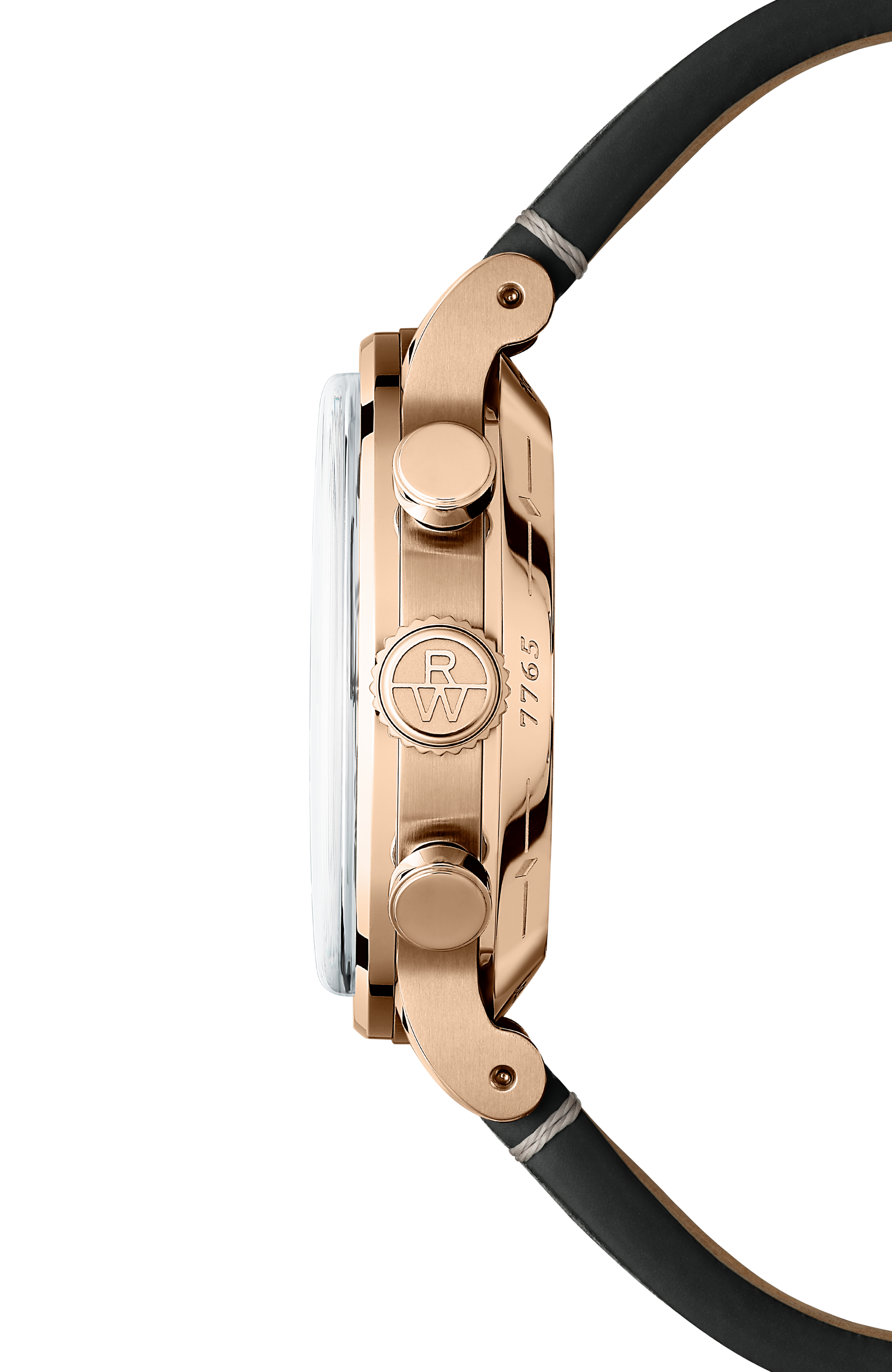 The 39mm stainless steel with rose gold PVD coating case encompasses a combination of smooth and snailed contrasting finishes and is attached to a black genuine calf leather strap. At the heart of the millesime tri-compax chronograph sits the RW5030 mechanical chronograph self-winding movement. Visible through the exhibition case back, this automatic movement has a power reserve of 62-hours, ensuring accuracy and reliability for all of your adventures.