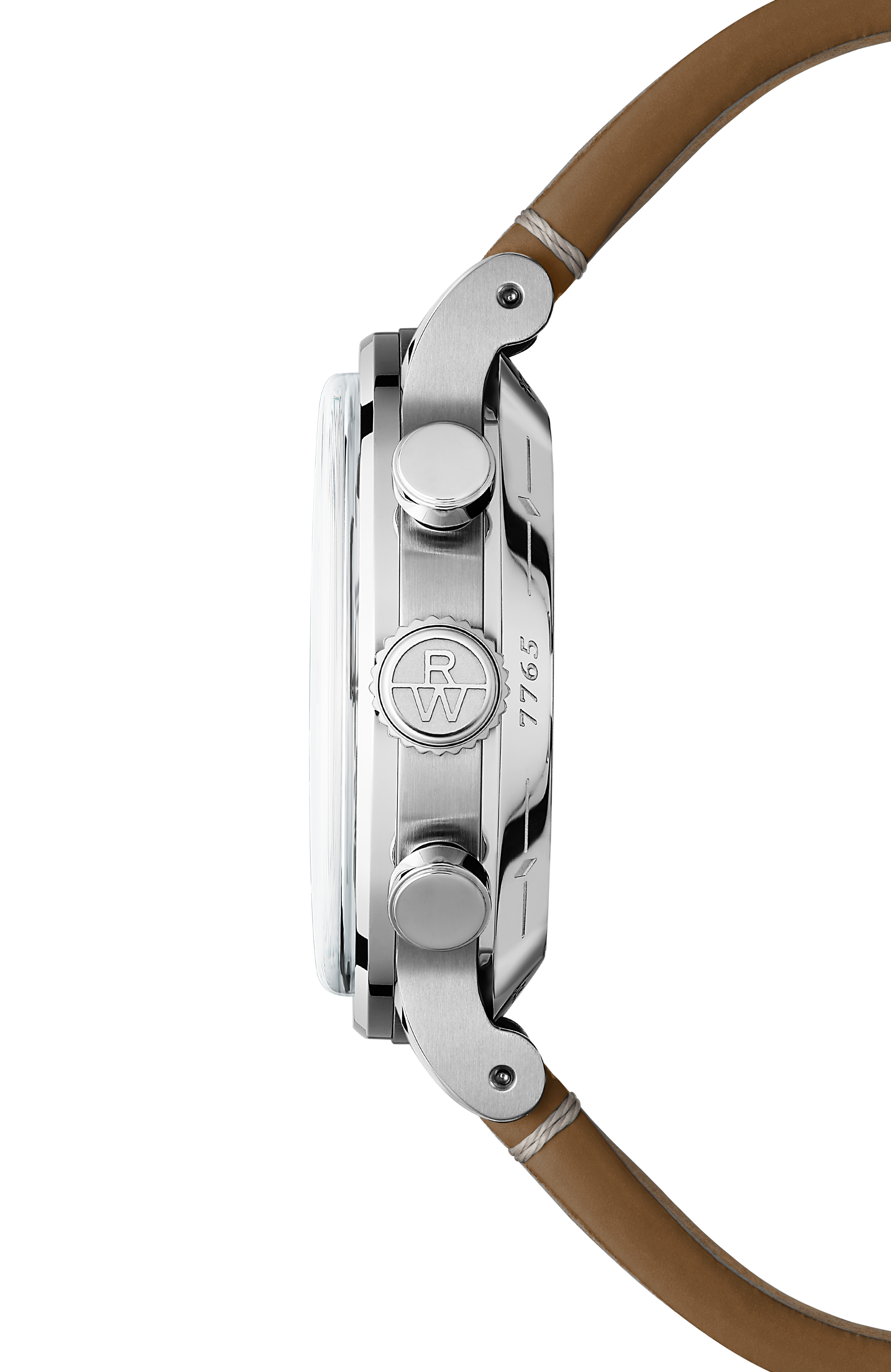 The 39mm stainless steel case encompasses a combination of smooth and snailed contrasting finishes and is attached to a camel genuine calf leather strap. At the heart of the millesime tri-compax chronograph sits the RW5030 mechanical chronograph self-winding movement. Visible through the exhibition case back, this automatic movement has a power reserve of 62-hours, ensuring accuracy and reliability for all of your adventures.