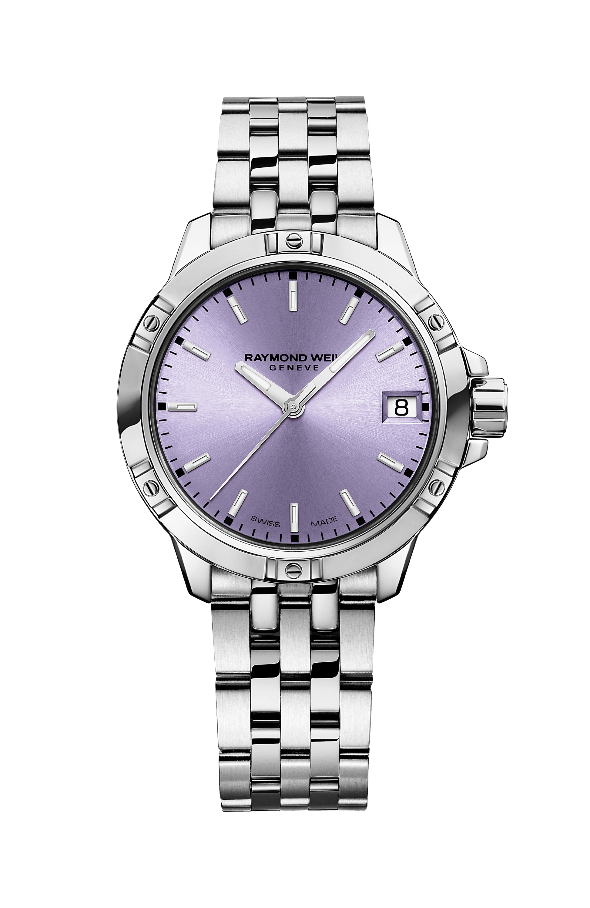 The lavender dial is bright and fresh, encompassing a sunray finish as well as a date window at 3 o’clock. The hour and minute hands are treated with Super-LumiNova®, allowing for enhanced readability in restricted light. The hours are denoted with slim batons and a central seconds hand has been added for precision. The screwed-down crown, enabling water resistance up to 100m, features the RW monogram.