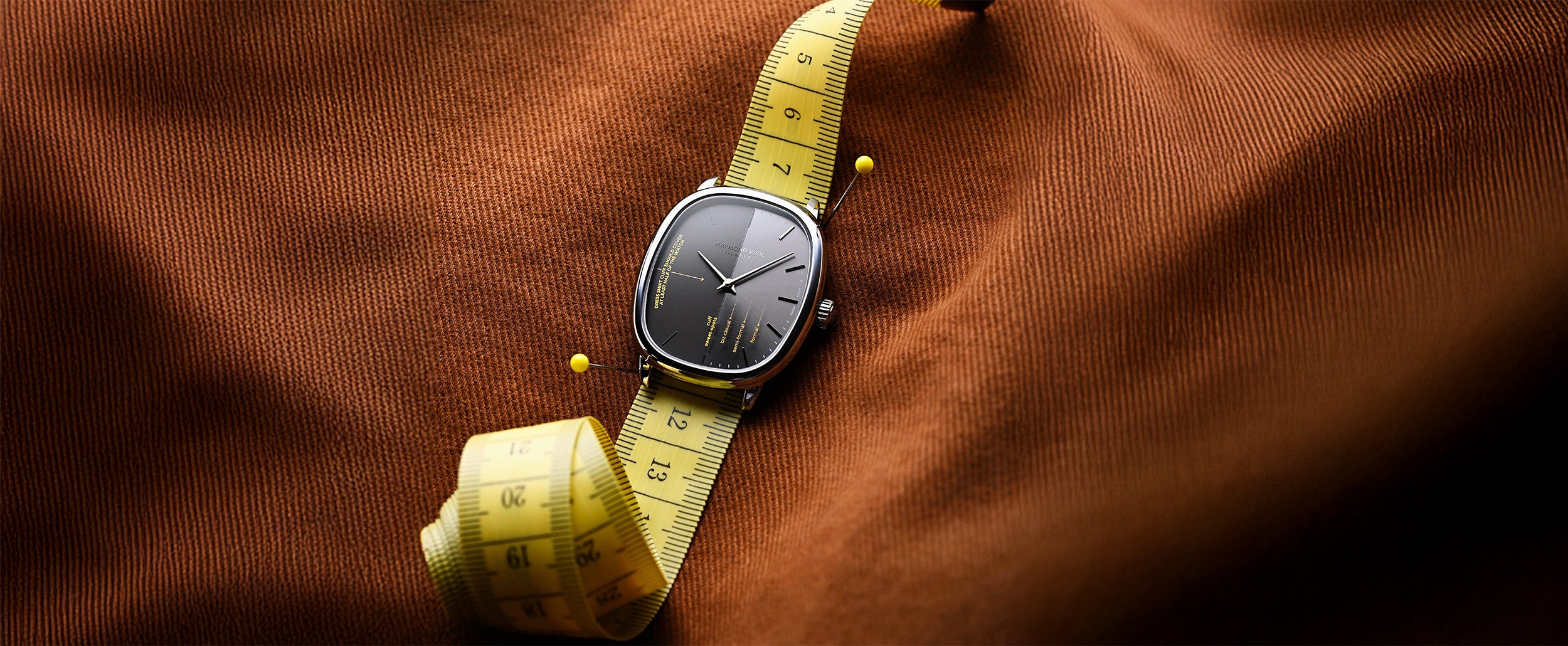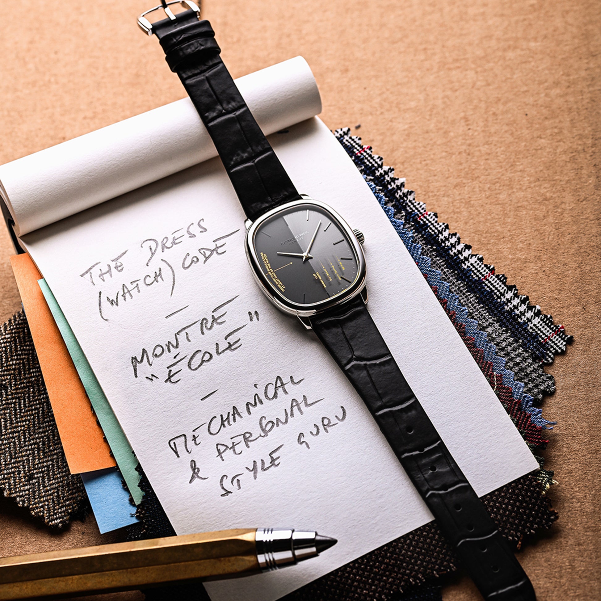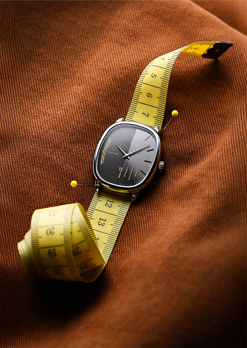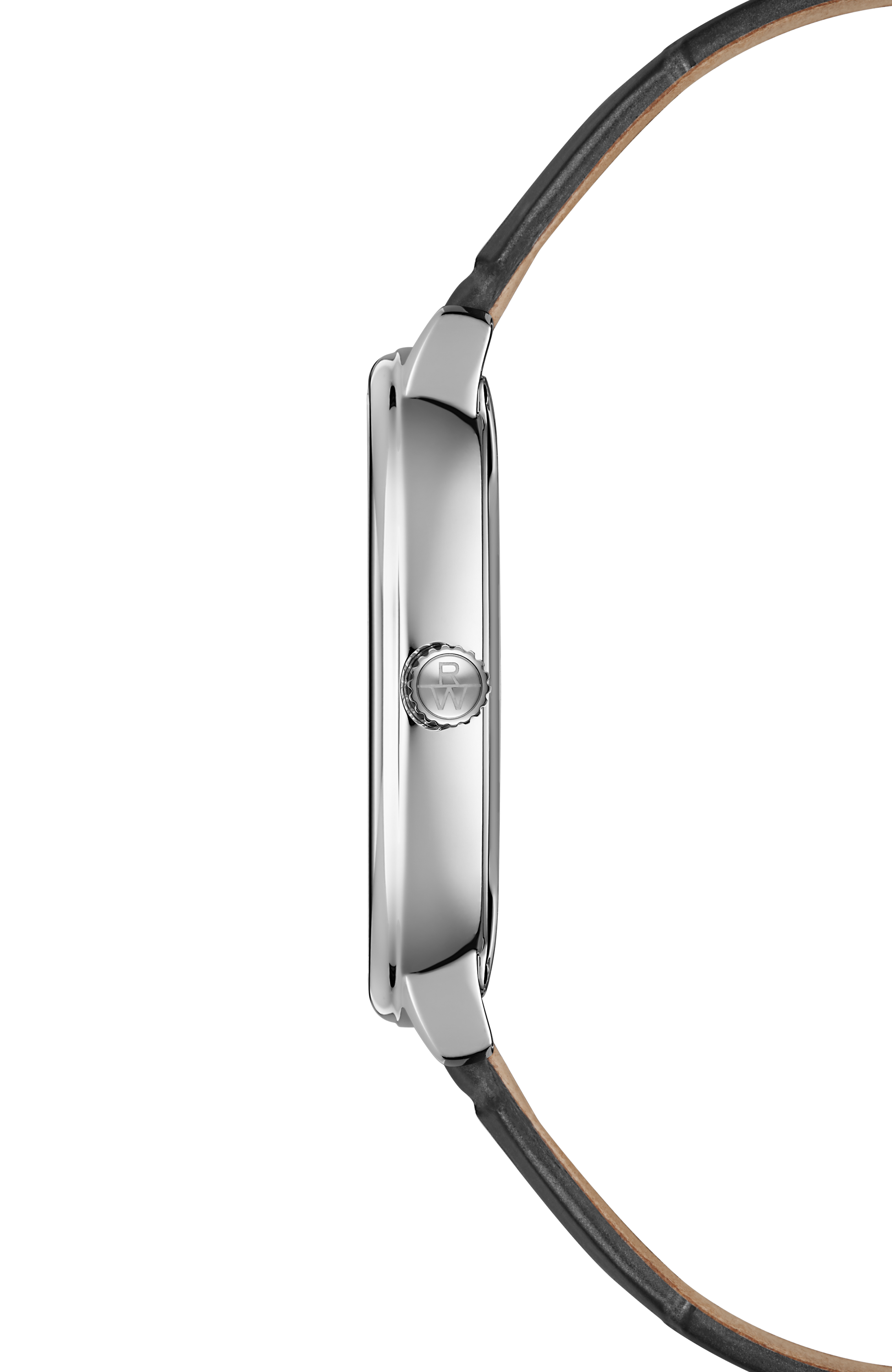 The limited-edition reference 2280 plays on a subtle duality; two faces of elegance and precision. Its stainless-steel case houses an anthracite-grey dial distinguished by two contrasting designs. On the left side, an ethereal, almost ghostly finish conceals certain details, echoing the concept itself: the dress shirt cuff should cover at least half of the watch. The matte anthracite opaline finish and glossy transparent transfers of its indexes nonetheless ensure perfect legibility. At 9 o’clock, a yellow inscription sets the tone, or rather, the rule: “Dress shirt cuff should cover at least half of the watch.” In other words: “Raymond Says” a dress watch should only be half revealed.