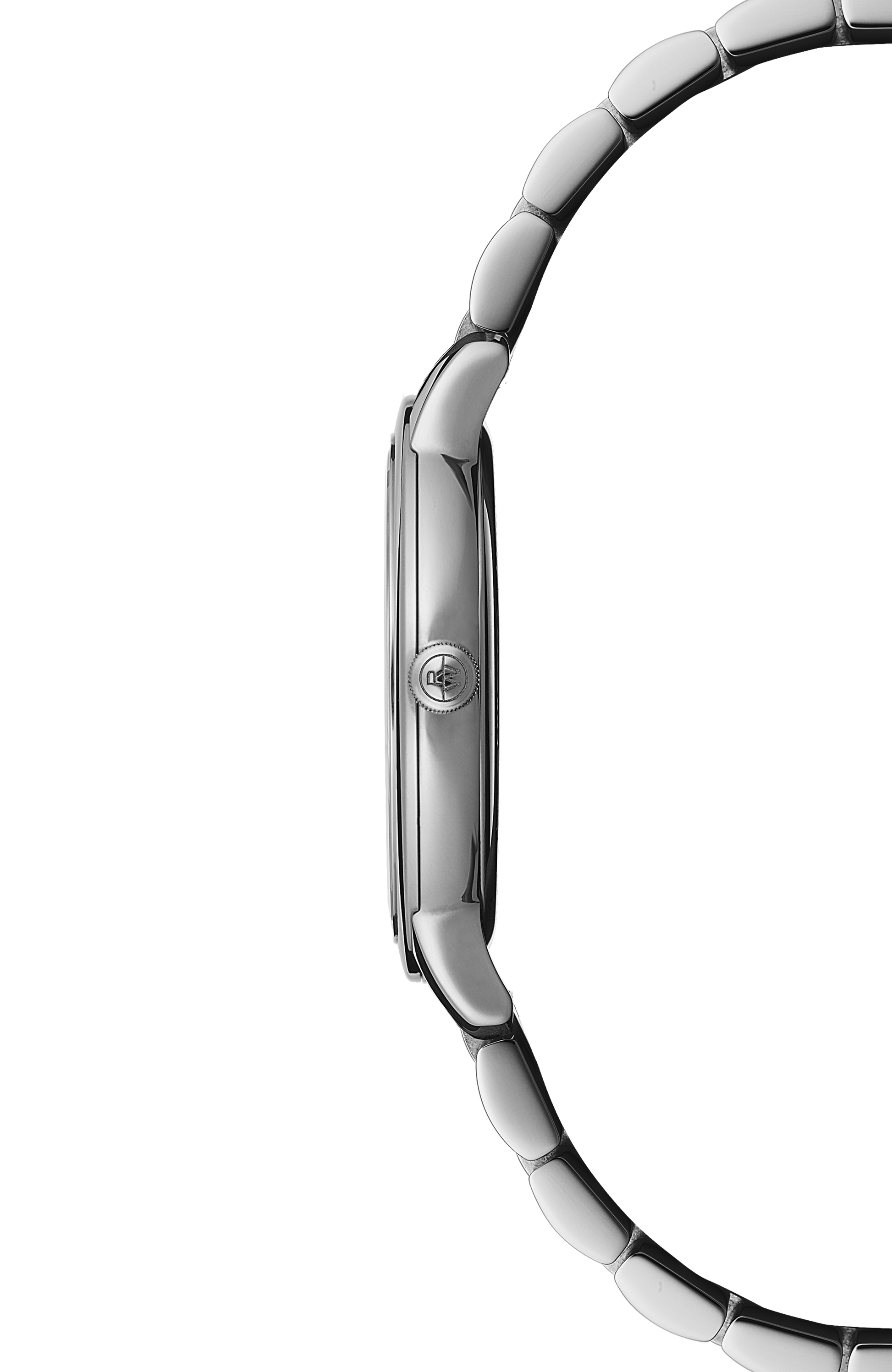 Equipped with a quartz movement and made entirely of stainless steel, this toccata ladies' watch features a sleek stainless steel 34 mm case with a date window at 3 o’clock. The silver lacquered and sunray satin-finished dial is set with applied Roman numeral indexes and has a railway-track chapter ring that aids readability. To complement this modern classic, a pair of blue hands has been added.