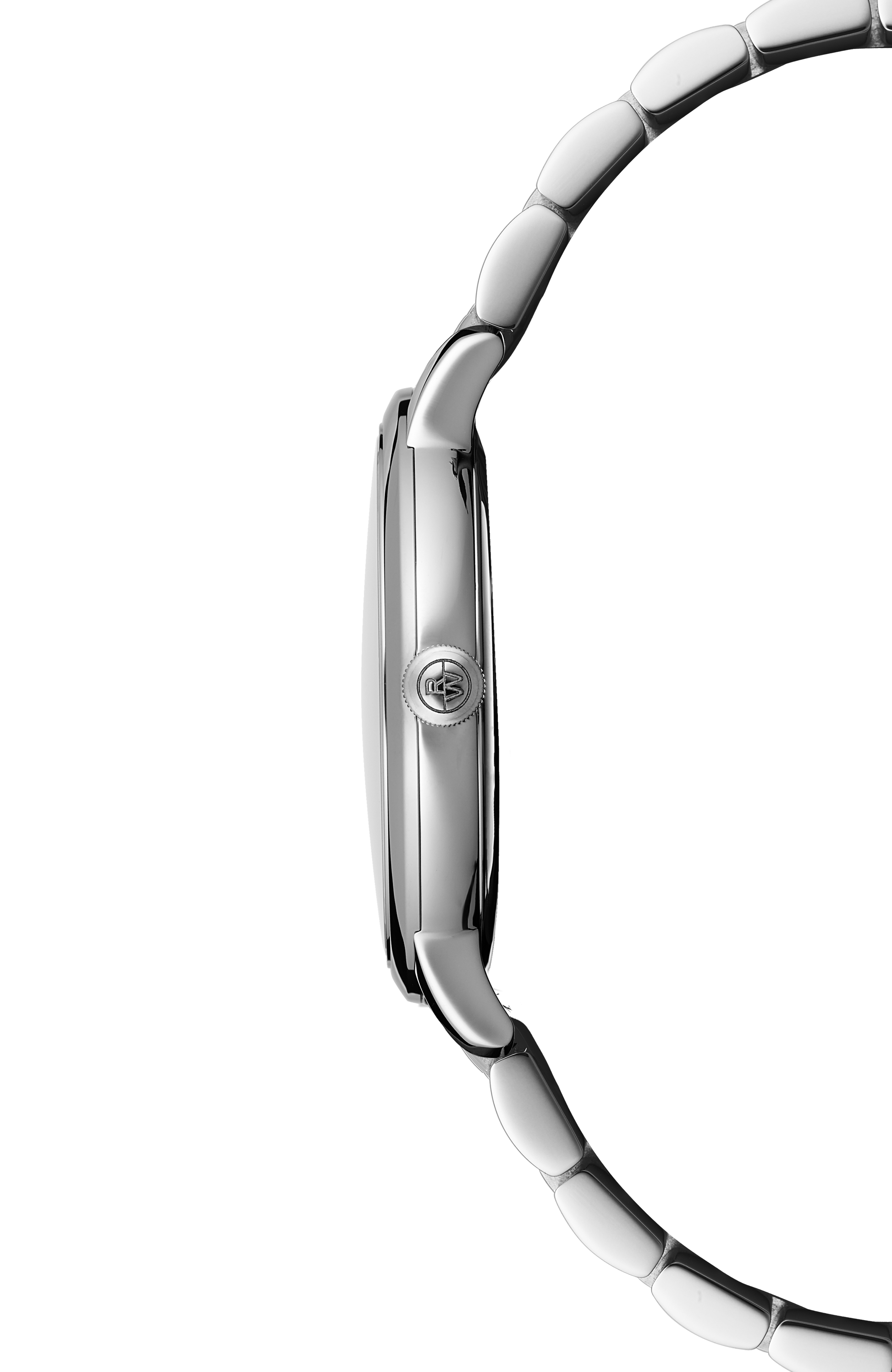 Equipped with a quartz movement and made entirely of stainless steel, this toccata men’s watch features a sleek stainless steel 39 mm case with a date window at 3 o’clock. The white lacquered dial is set with applied Roman numeral indexes and has a railway-track chapter ring that aids readability. To complement this modern classic, a pair of blue hands has been added.