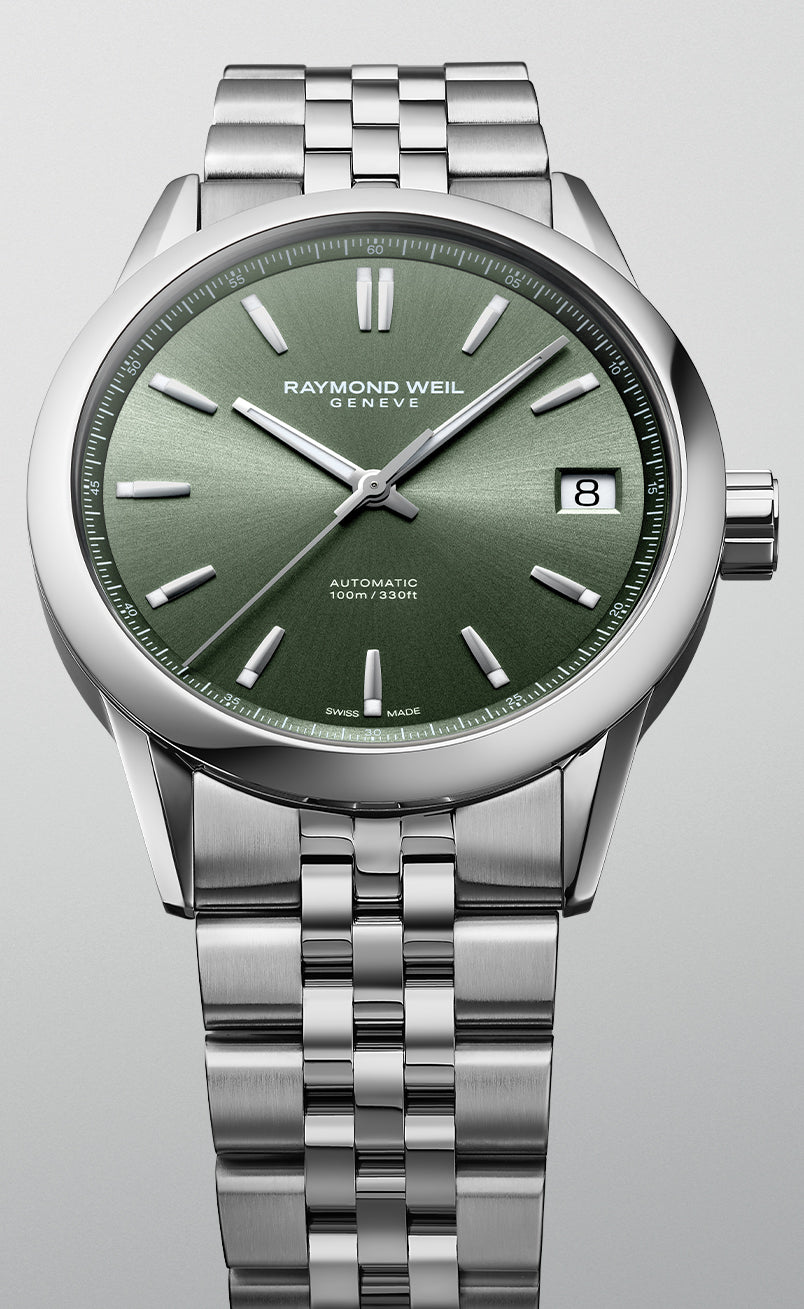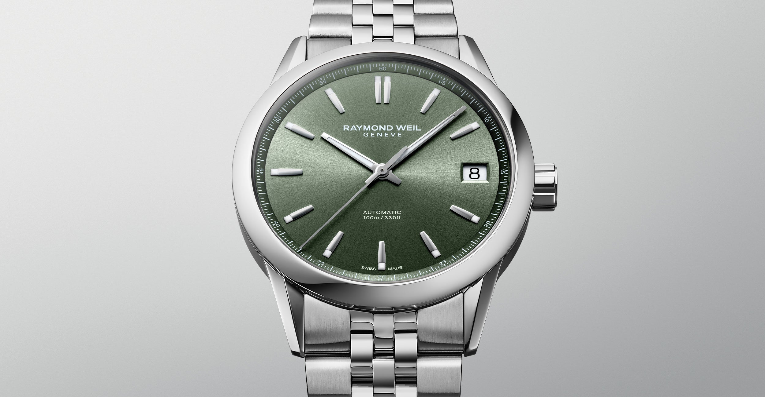 迷人的绿色表盘经放射纹与细腻拉丝工艺打造,层次深邃,于光影交错间展现灵动之美。立体时标覆以白色 Super-LumiNova® 夜光涂层,配合纤细指针,读时清晰易辨;3 点位大日历显示赋予腕表现代格调。内圈分钟刻度环布局精致匀称,使整体设计更趋平衡和谐。