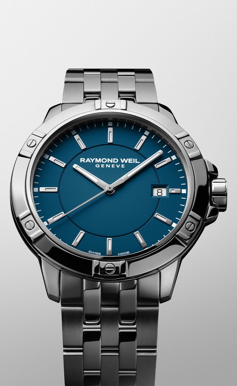 探戈经典系列男士腕表配备直径41毫米的精钢圆形表壳,优雅的蓝色表盘点缀覆有Super-LumiNova®夜光涂层的时标,并于3点钟位置设有日期显示窗。